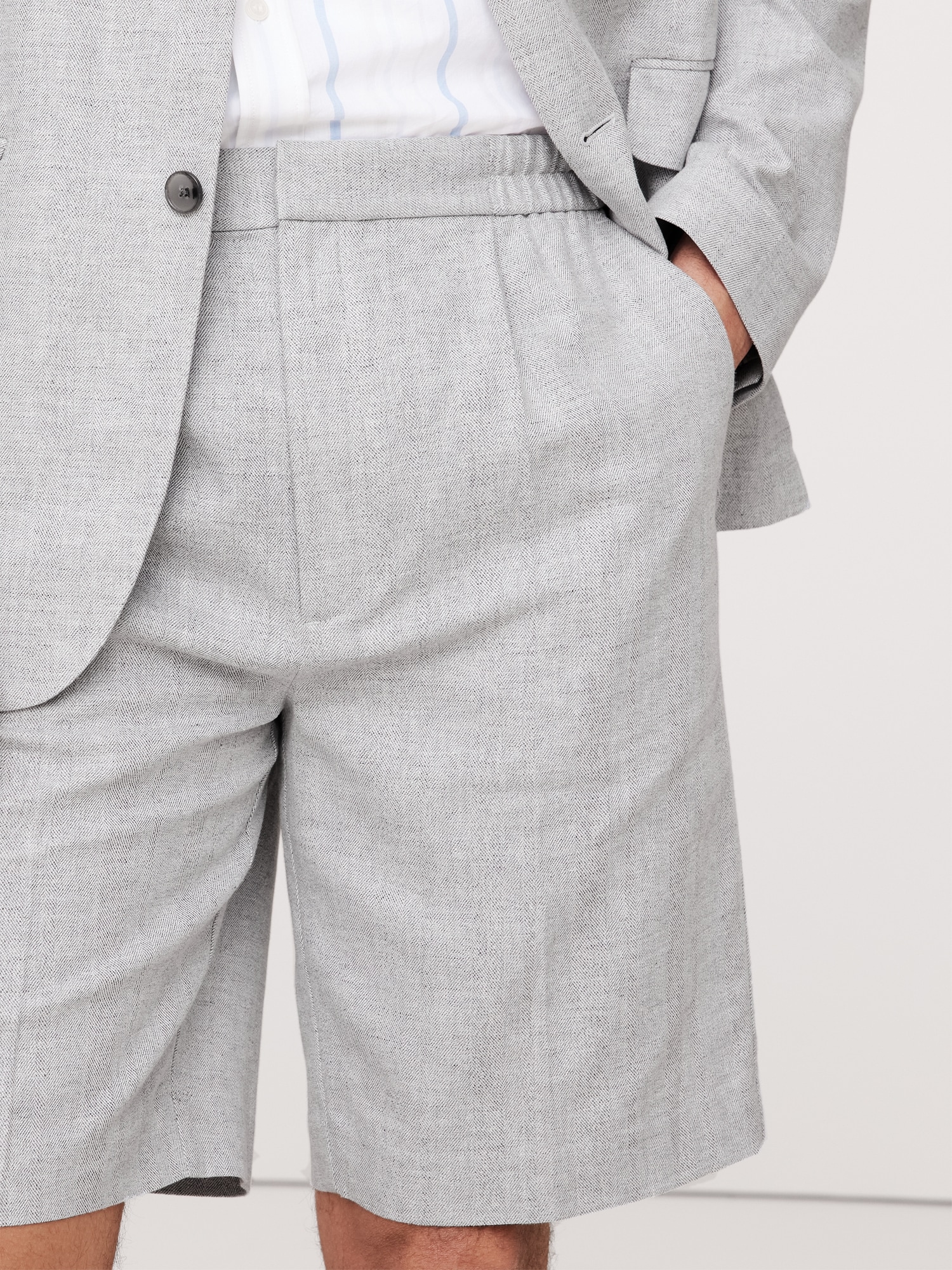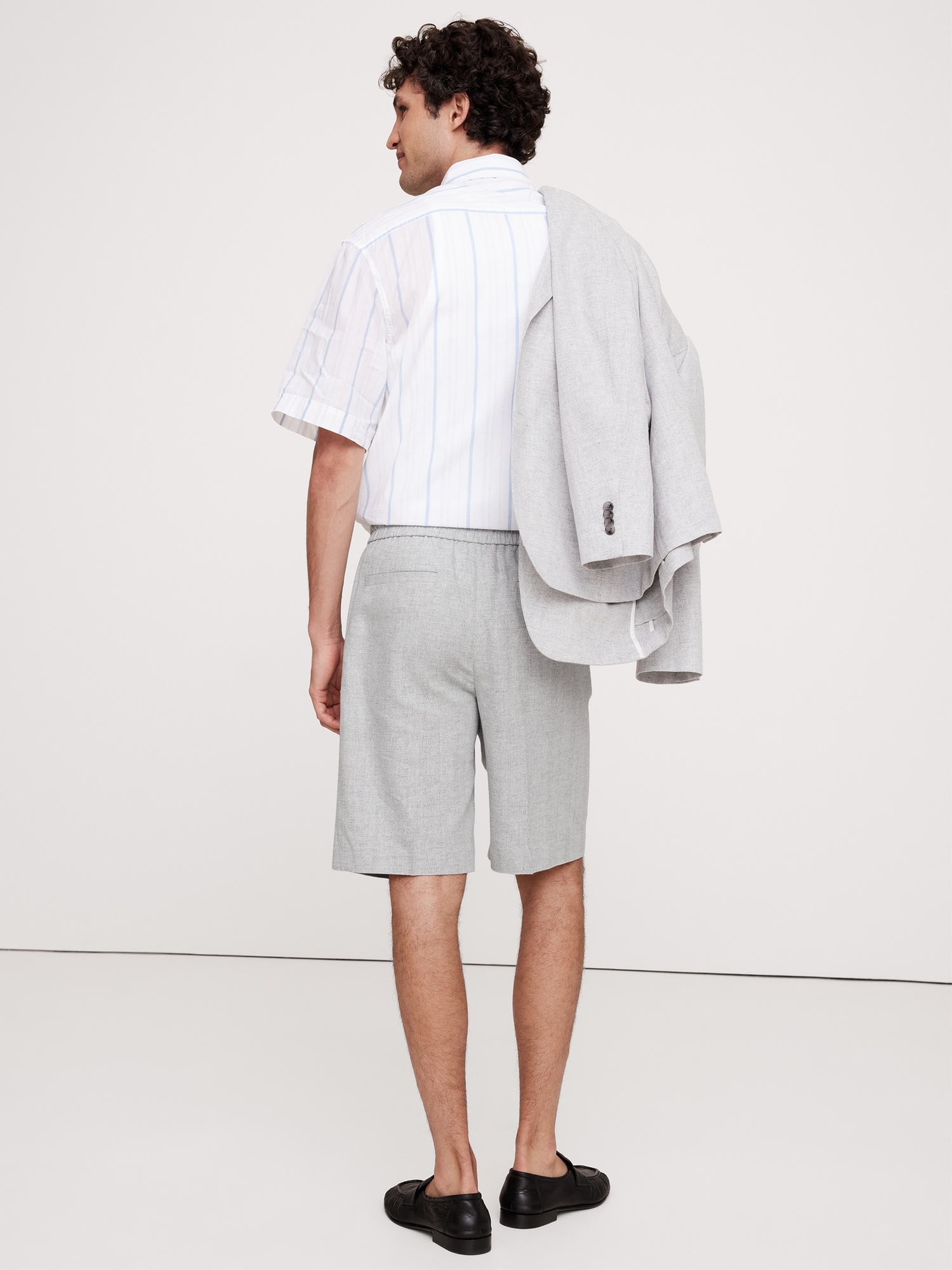 Cut from a herringbone linen-cotton fabric, these tailored shorts have an elastic waistband at back and a fully functional fly. Try it with the matching suit jacket—hello, wedding season.
