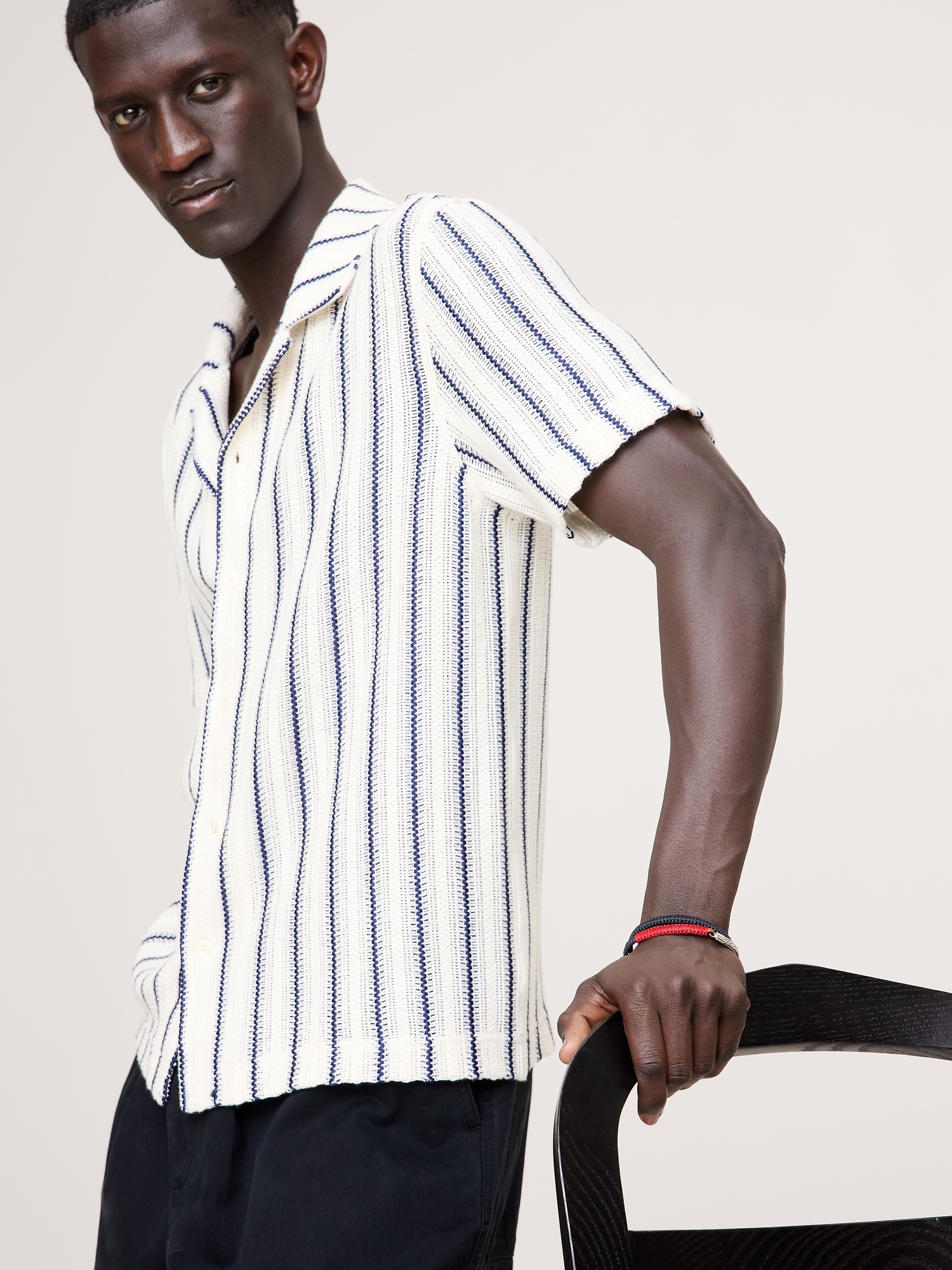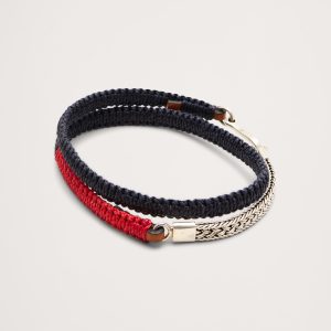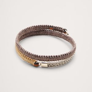This double-wrap bracelet is crafted from vegetable-dyed leather with hand-knotted macramé-style cord and a stretch of handwoven sterling silver.