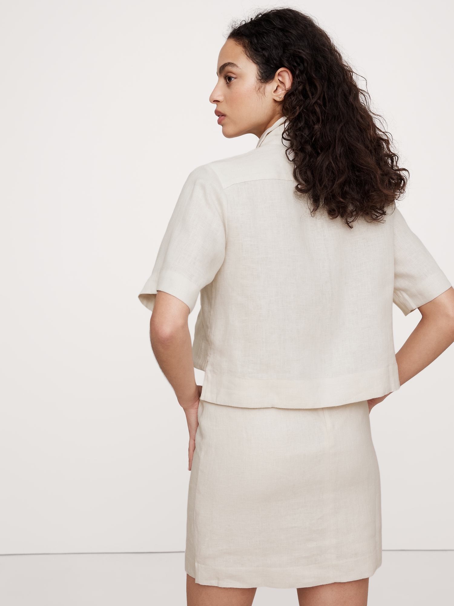 A little linen moment. This boxy top is cut from certified European flax linen with premium details: a covered button placket, chest pockets, and a high-low hem. Pair with the matching mini skirt or style with high-rise jeans.