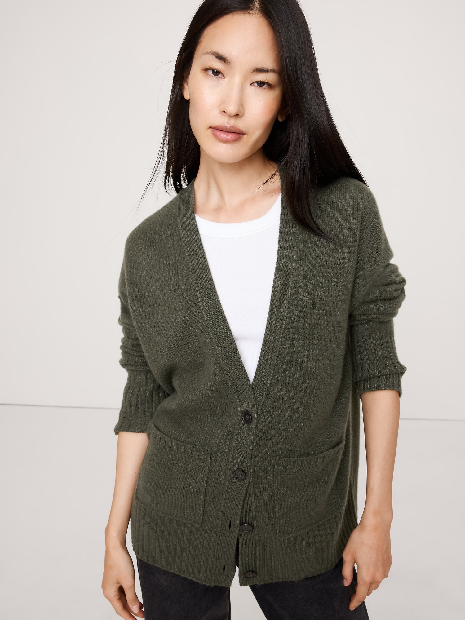 The vibe here is relaxed, yet put-together. We cut this boyfriend cardigan with extra room, adding pockets and exposed seam details for a fresh twist. To make it luxe, we selected our signature midweight cashmere yarn so it’s ideal in cooler seasons.