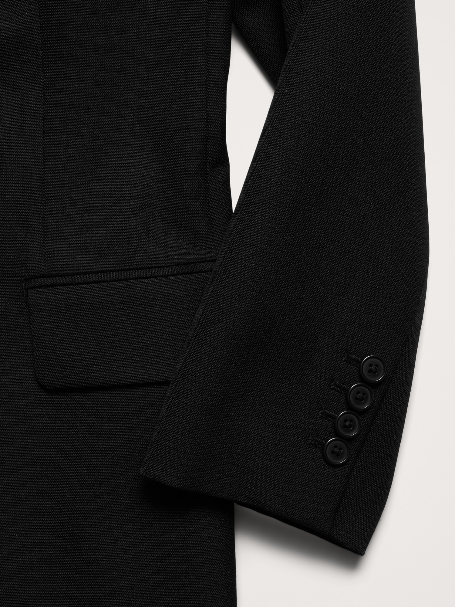 Notch lapel with single-button front.