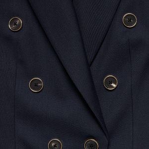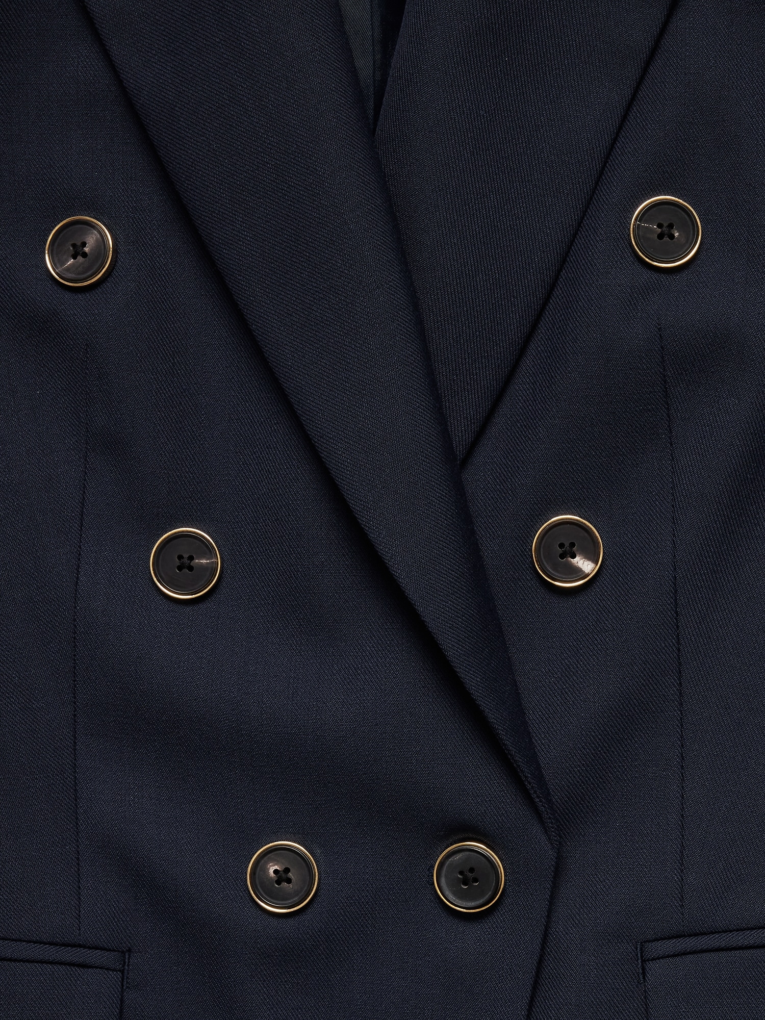 Peak lapel. Double-breasted gold crest button front.