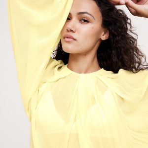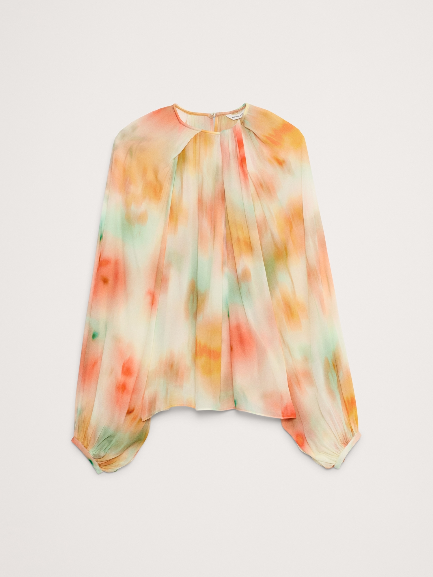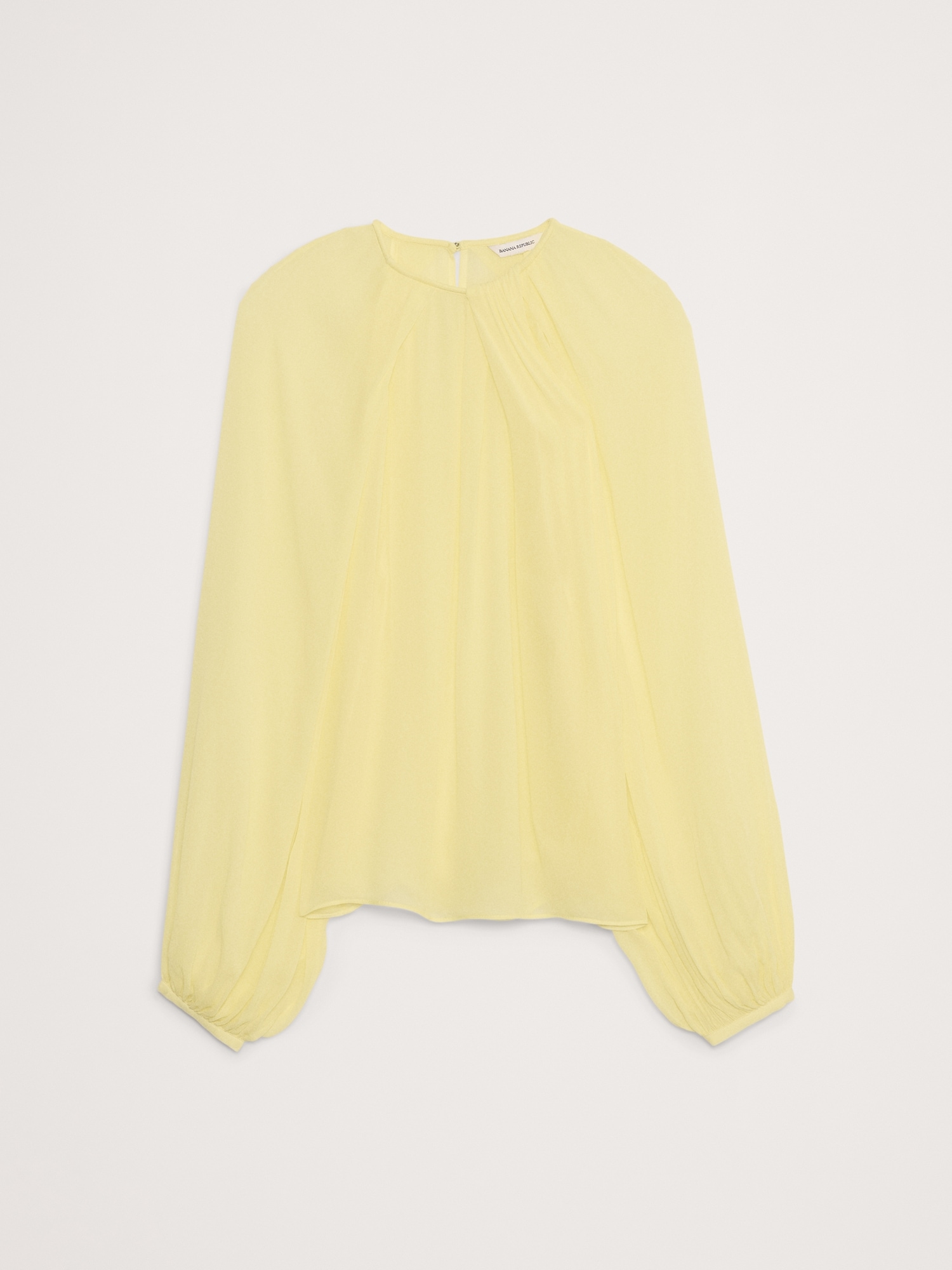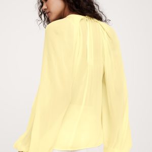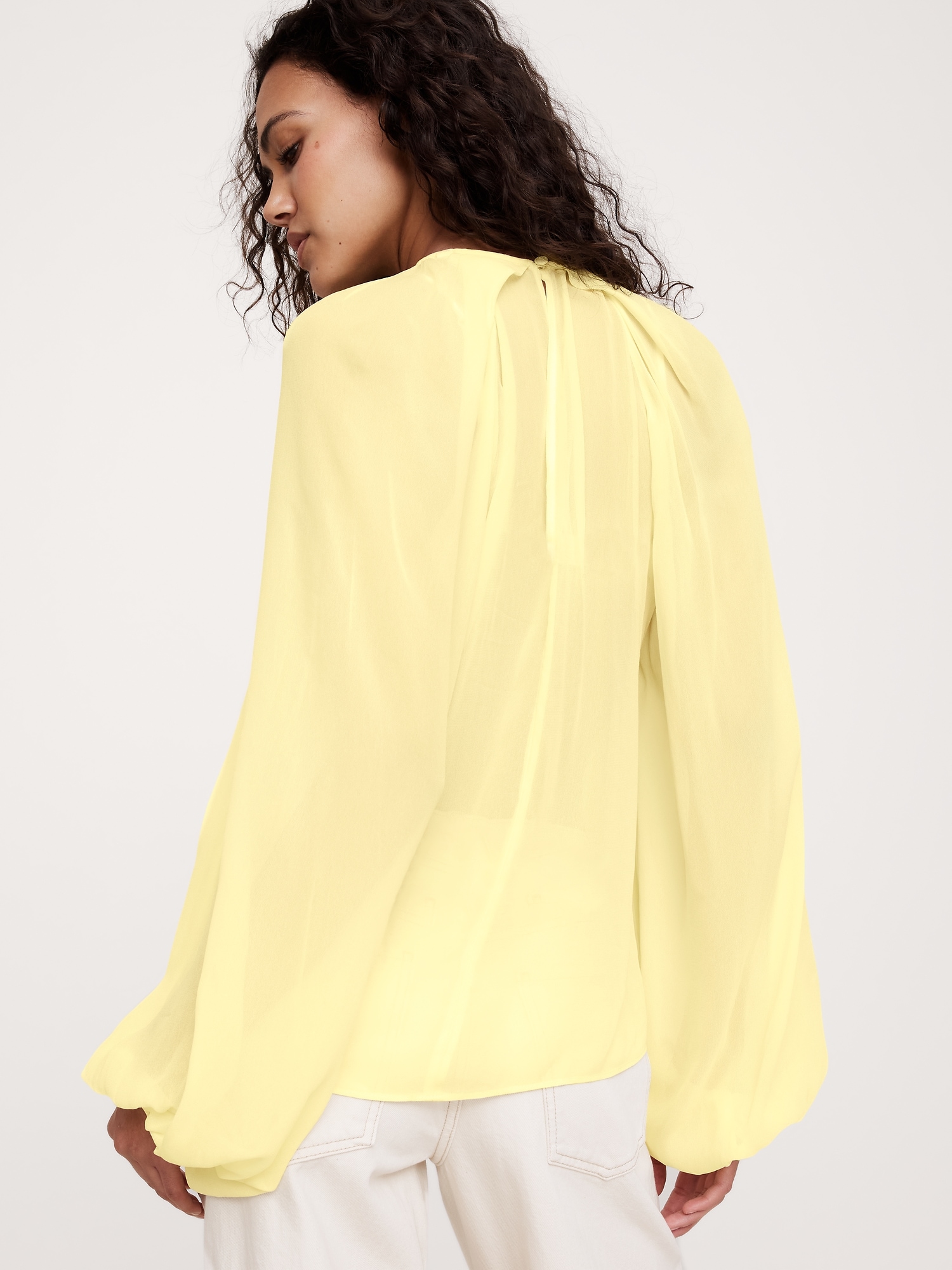 Designed with an easy fit that’s relaxed from the shoulders to the hem, this blouse has a shorter length paired with feminine, balloon sleeves and a chiffon construction. We love the twisted detail at the neck.