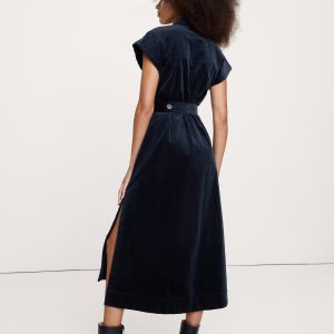 When it comes to a good shirt dress, no one does it quite like us. Here, we kept the silhouette clean with a banded collar—the better to show off this soft, fine-wale corduroy. Fit Flare: Fitted bust and waist with a flare skirt. Banded collar with button front. Belted waist. Front pockets. Side slits. Unlined. #817743