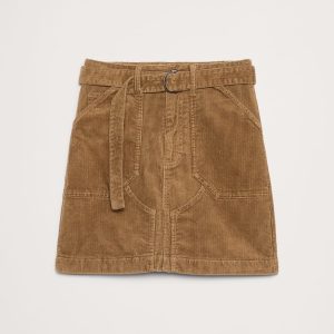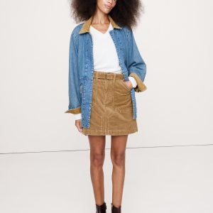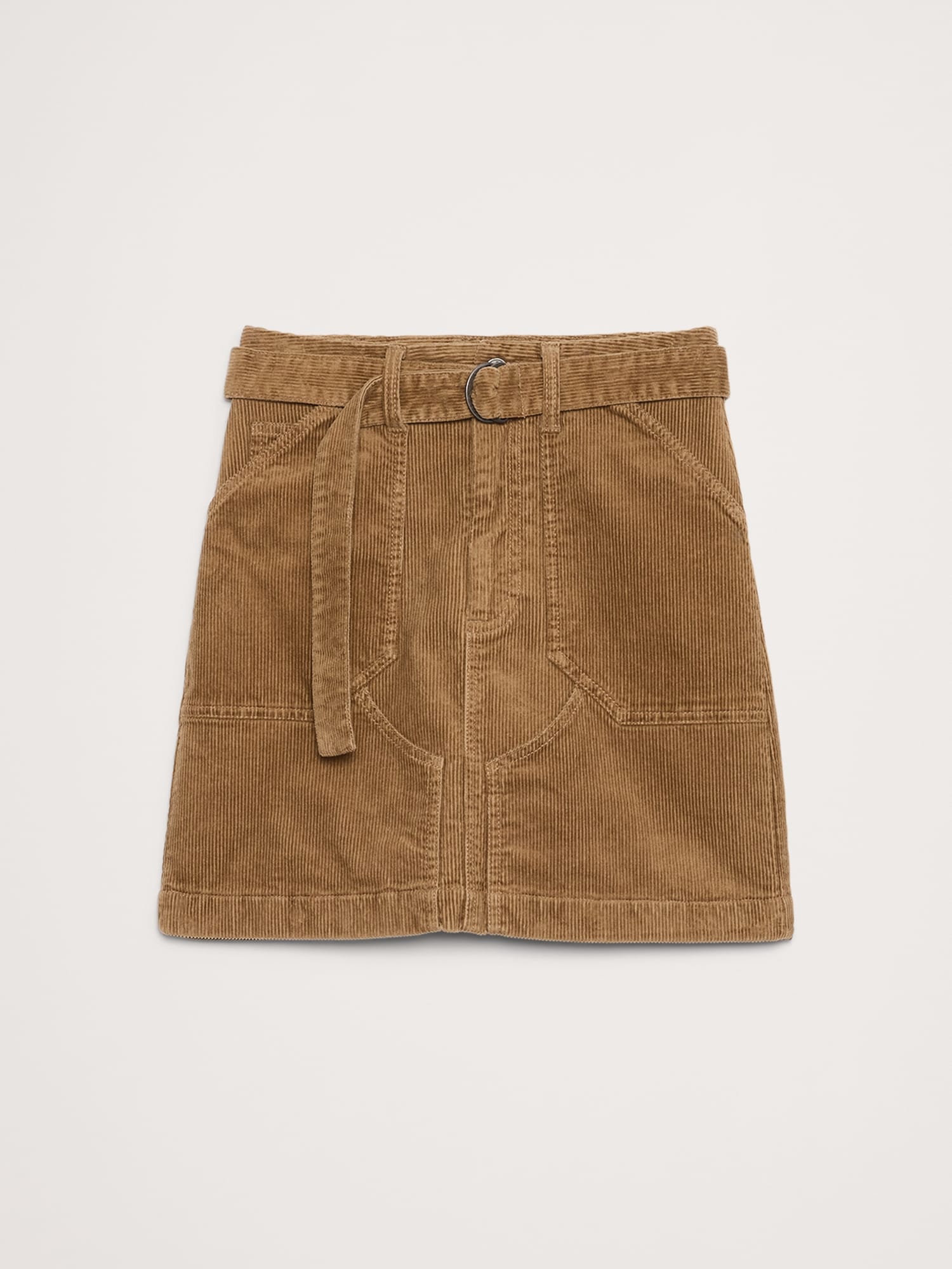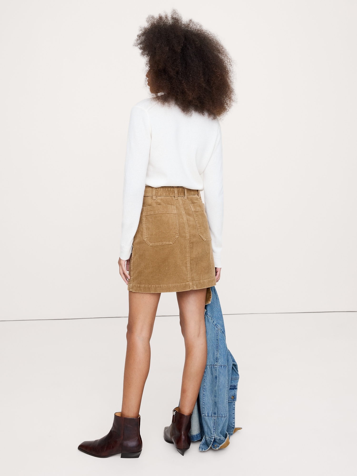Nothing says cold weather quite like corduroy. Here, we crafted a tailored mini skirt with paneled, utility pocket details.