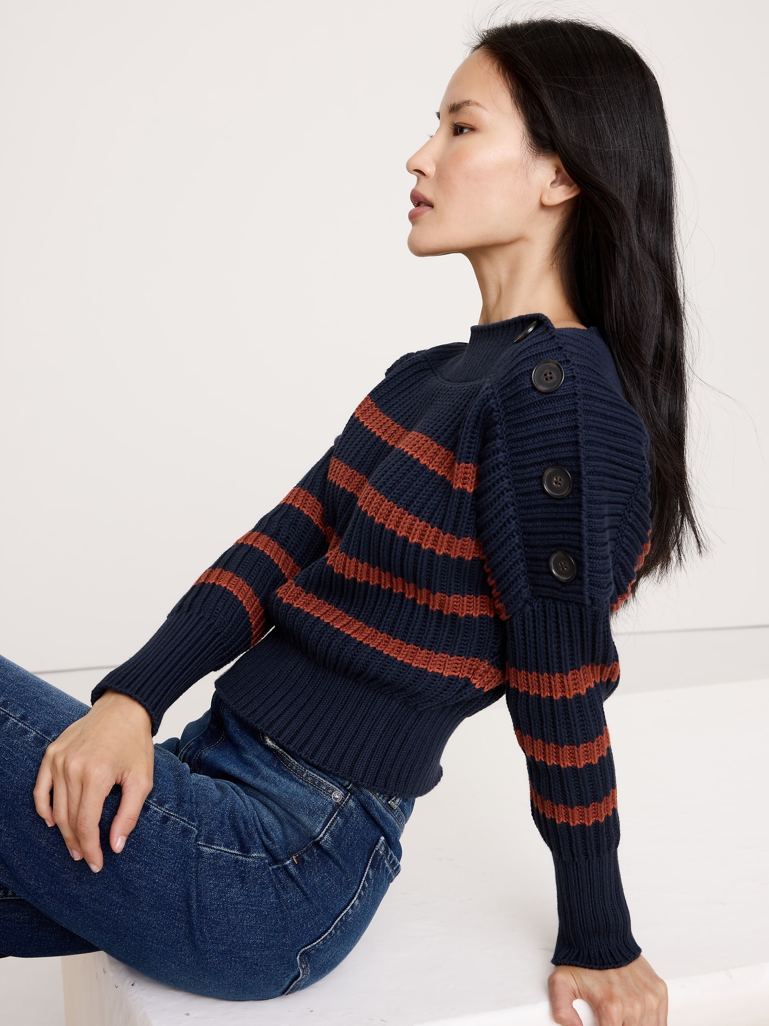 We love a boatneck sweater. Here, we borrowed the button-shoulder detail from a vintage sweater, and recreated it in one of our favorite organic cotton yarns—one we love for its softness and all-season weight.