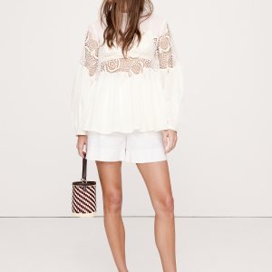 In your romantic era. This billowing top is cut from cotton lawn (so it’s lighter than poplin), with embroidered, cutwork lace accents.