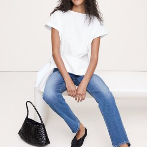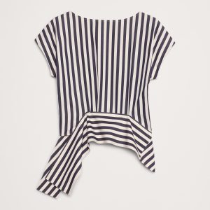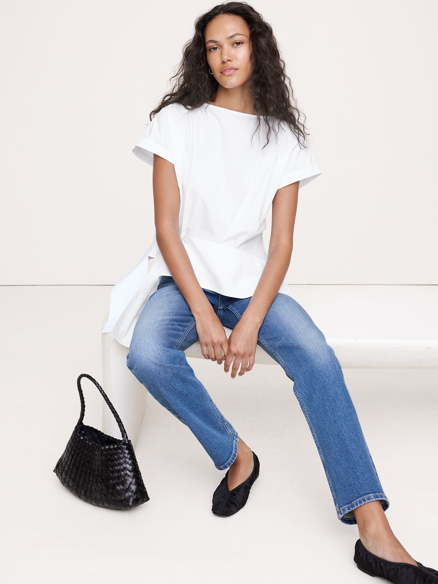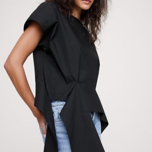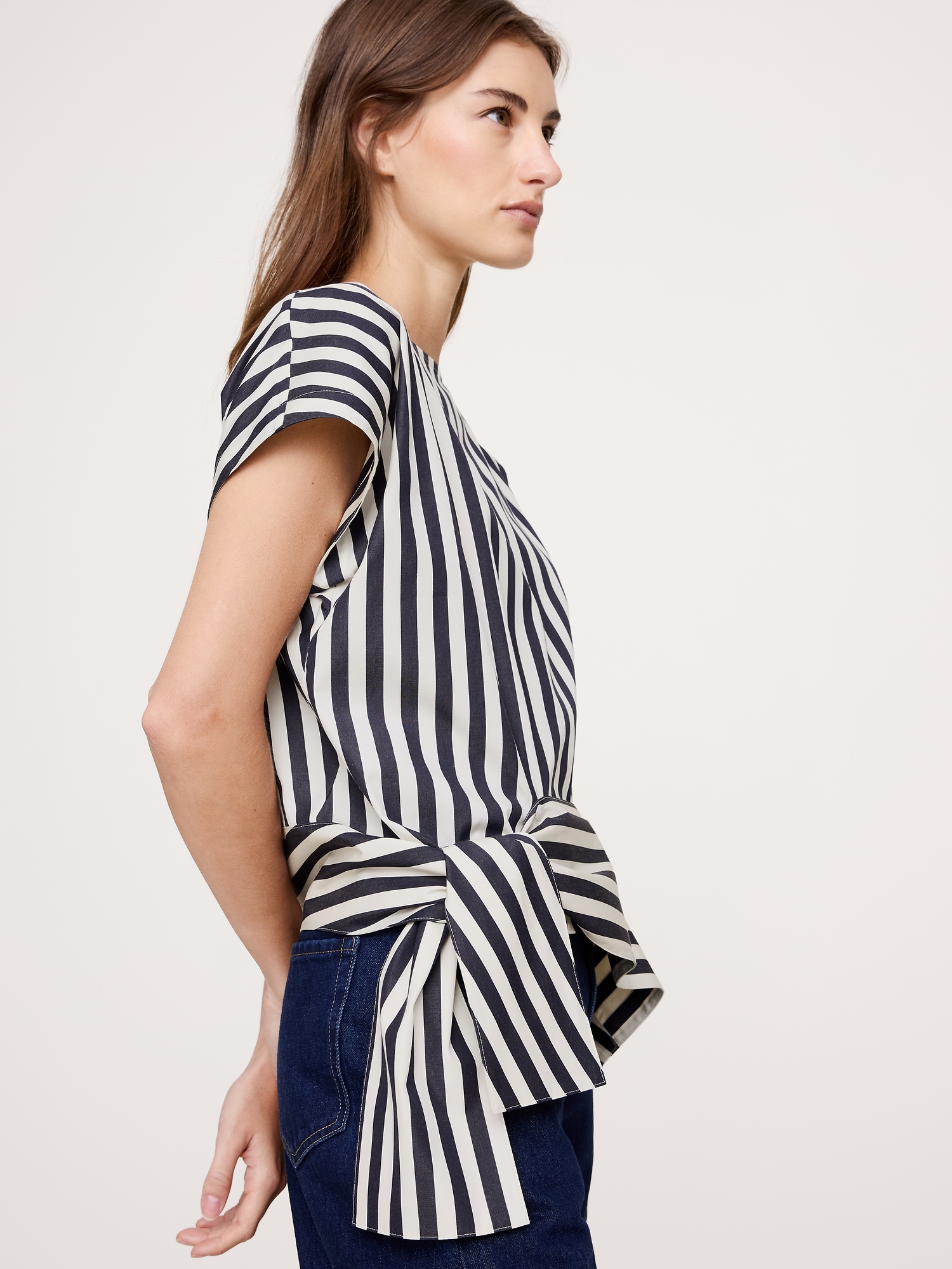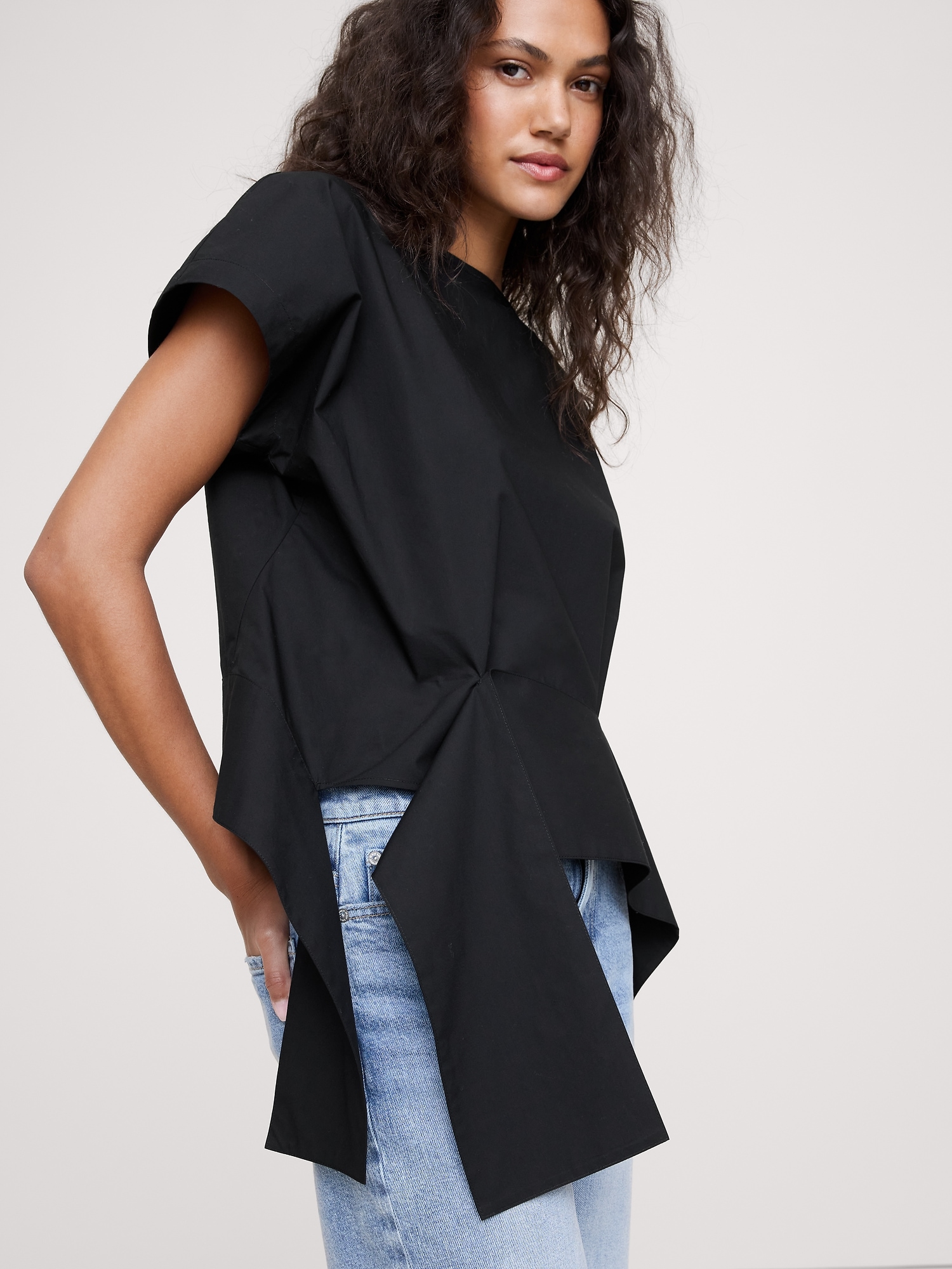 Deconstructed, reconstructed. This cotton poplin shirt borrows elements from the classic shirt, with a boatneck and asymmetrical hem twist. Let the bottom sash down or tie at the side to cinch the waist.