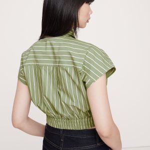 An invitation to play with proportions. This reimagined collared shirt has elastic at the hem and a tapered fit through the body that creates a sharp-shouldered silhouette.