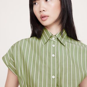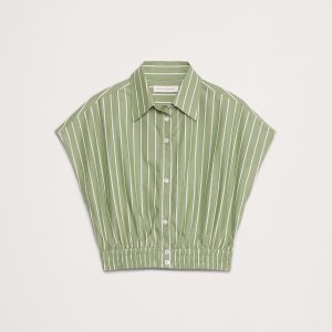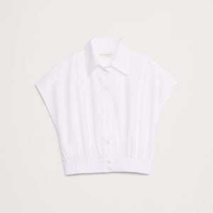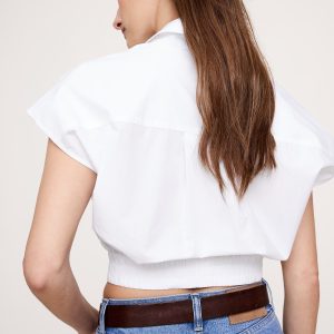 An invitation to play with proportions. This reimagined collared shirt has elastic at the hem and a tapered fit through the body that creates a sharp-shouldered silhouette.