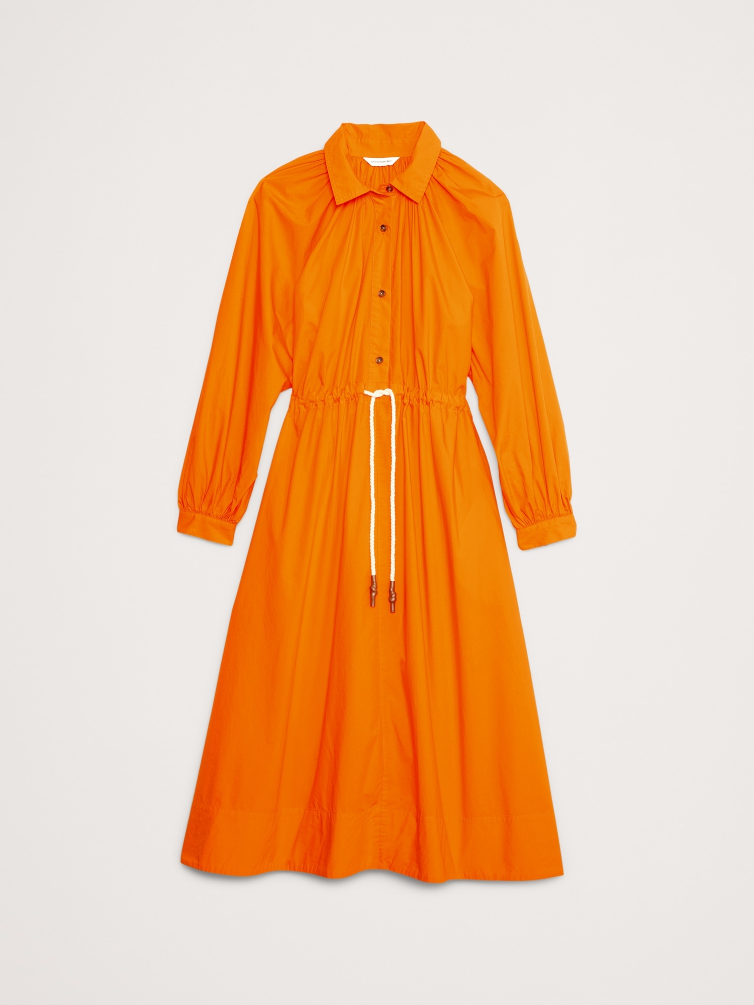 We’re loving cotton poplin right now (and always). This dress nods at the season’s volume-sleeve trend, fitted with shirtdress styling and a utilitarian drawstring at the waist.