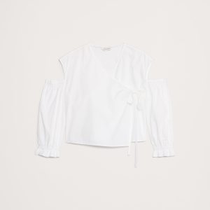 We cut this easy top with a wrap front and cut-out details—in our premium 100% cotton poplin. Relaxed fit: Relaxed fit through shoulders, chest and waist. V-neck with tie front closure. Elastic cuffs. Unlined. #770274