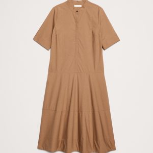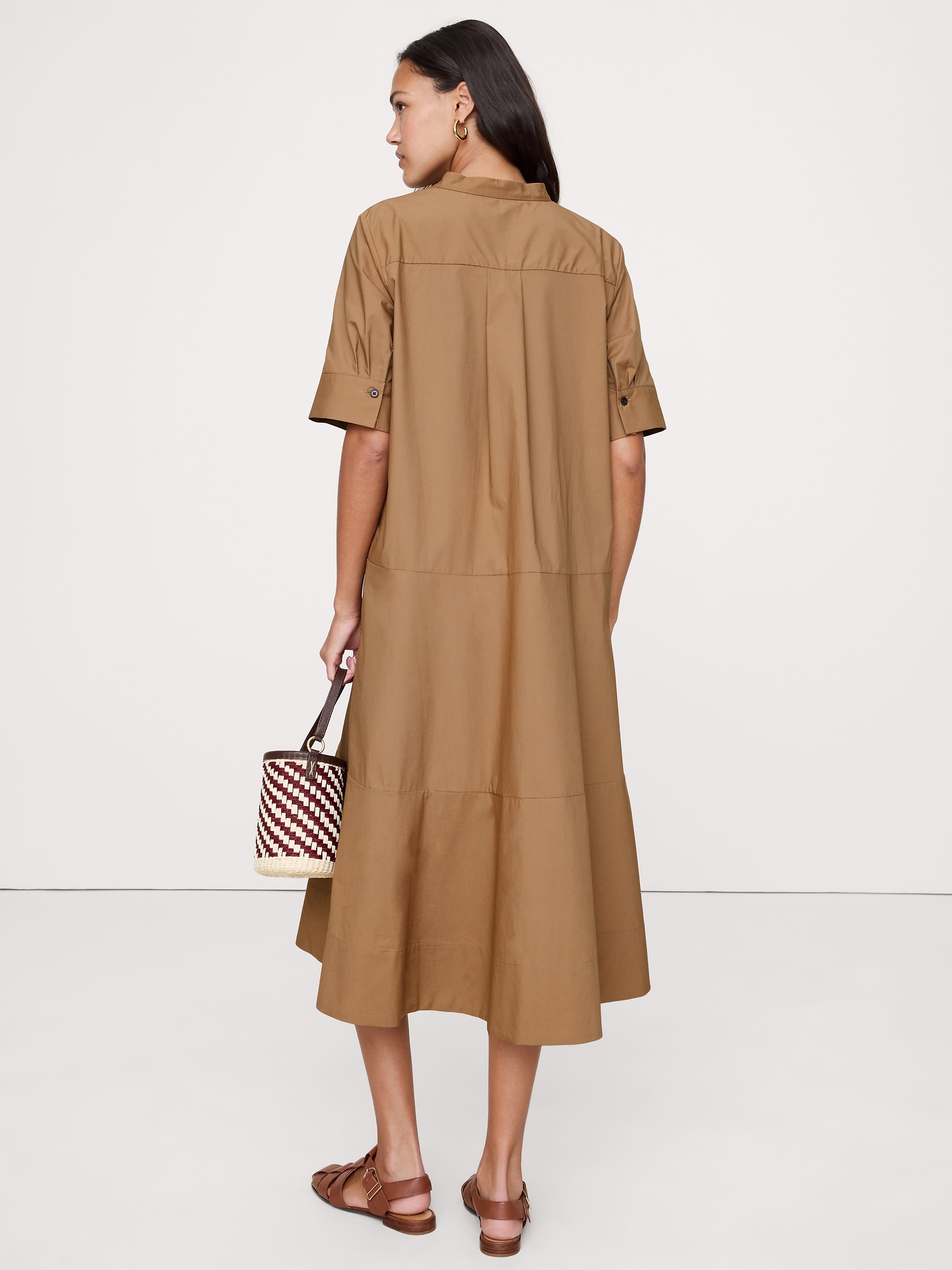 Bring on the sunshine. This is a relaxed shirt dress with a tuxedo-style front panel detail at the bodice, a tiered skirt, and an extra wide hem to add a little flounce.