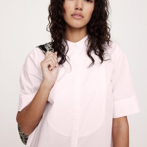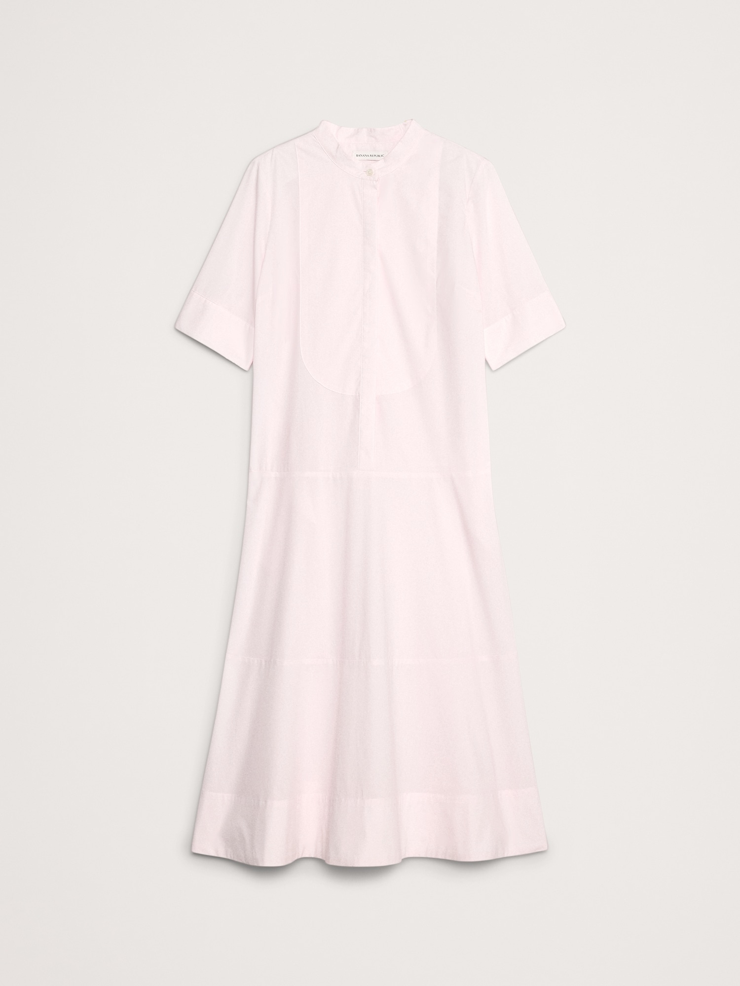Bring on the sunshine. This is a relaxed shirt dress with a tuxedo-style front panel detail at the bodice, a tiered skirt, and an extra wide hem to add a little flounce.