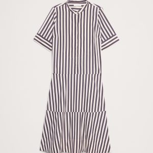 Bring on the sunshine. This is a relaxed shirt dress with a tuxedo-style front panel detail at the bodice, a tiered skirt, and an extra wide hem to add a little flounce.