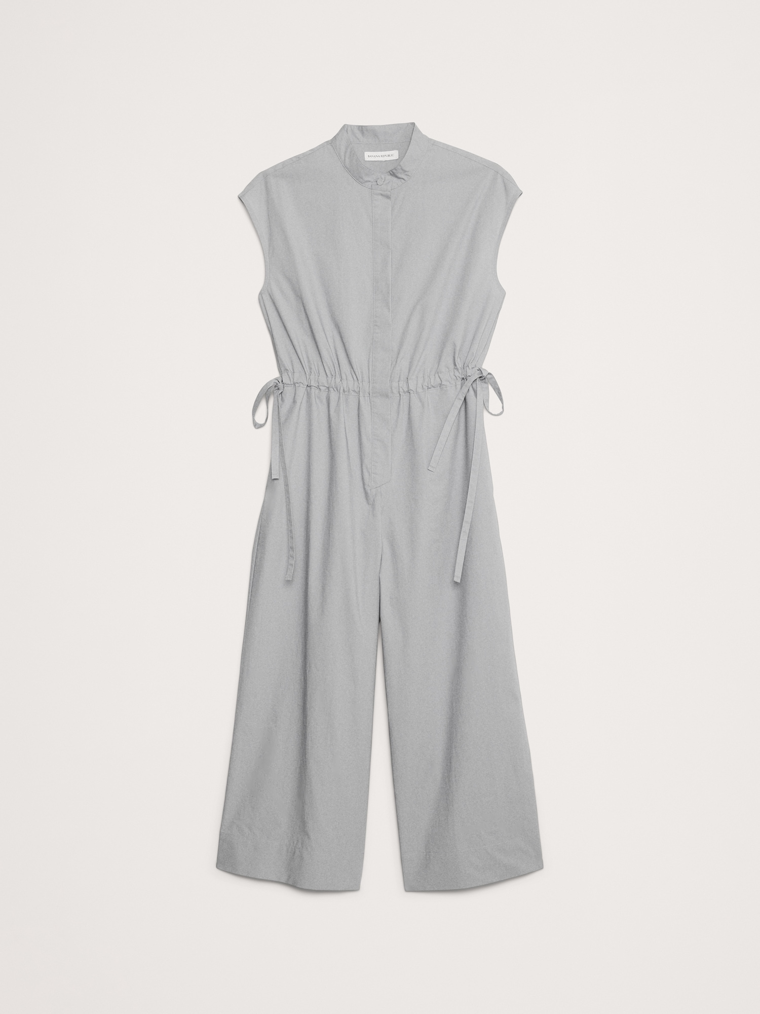 A reimagined boilersuit in 100% cotton poplin. We kept the utilitarian feel with a banded collar and concealed button front, but added a drawstring detail to define the waist.