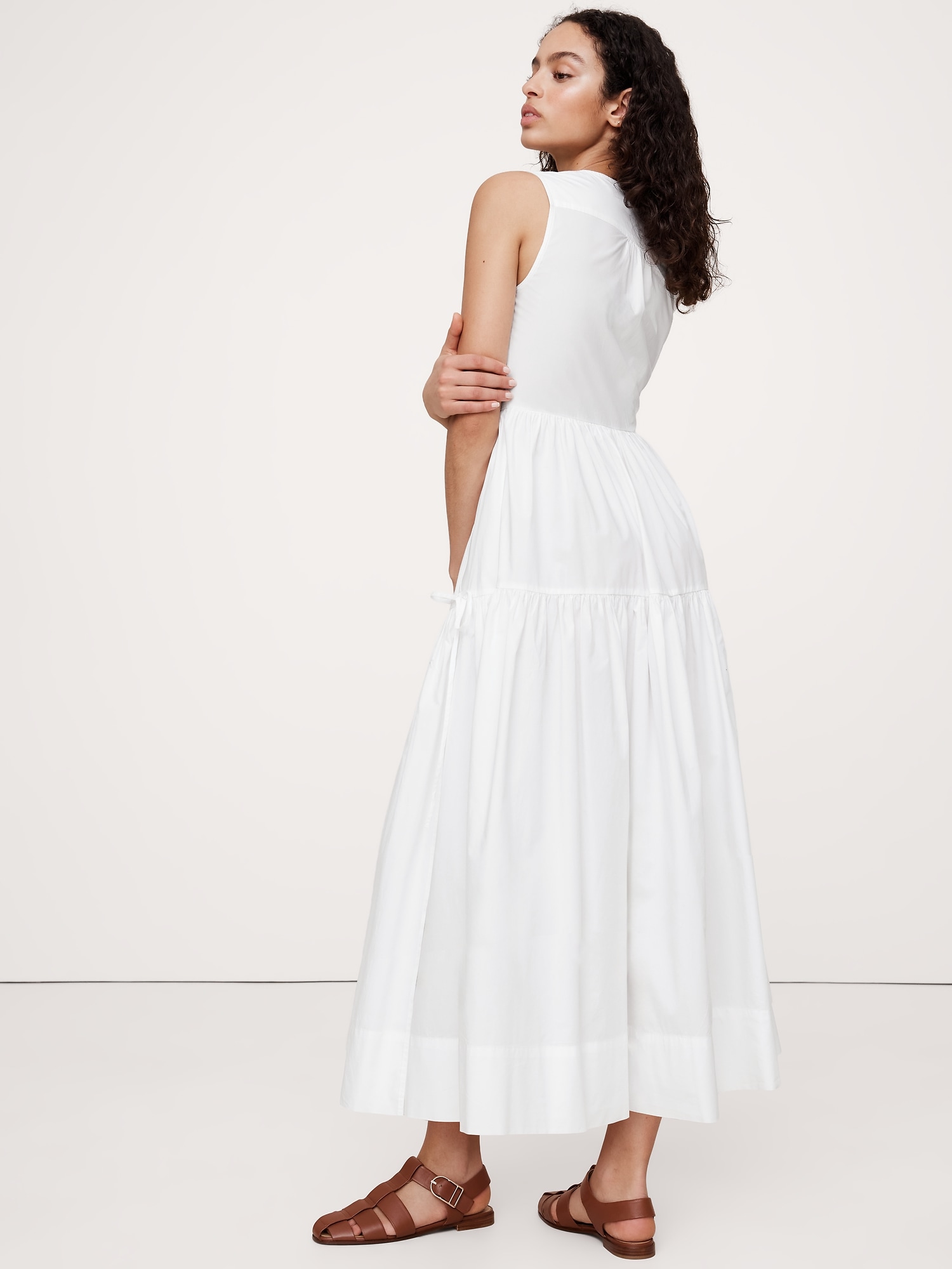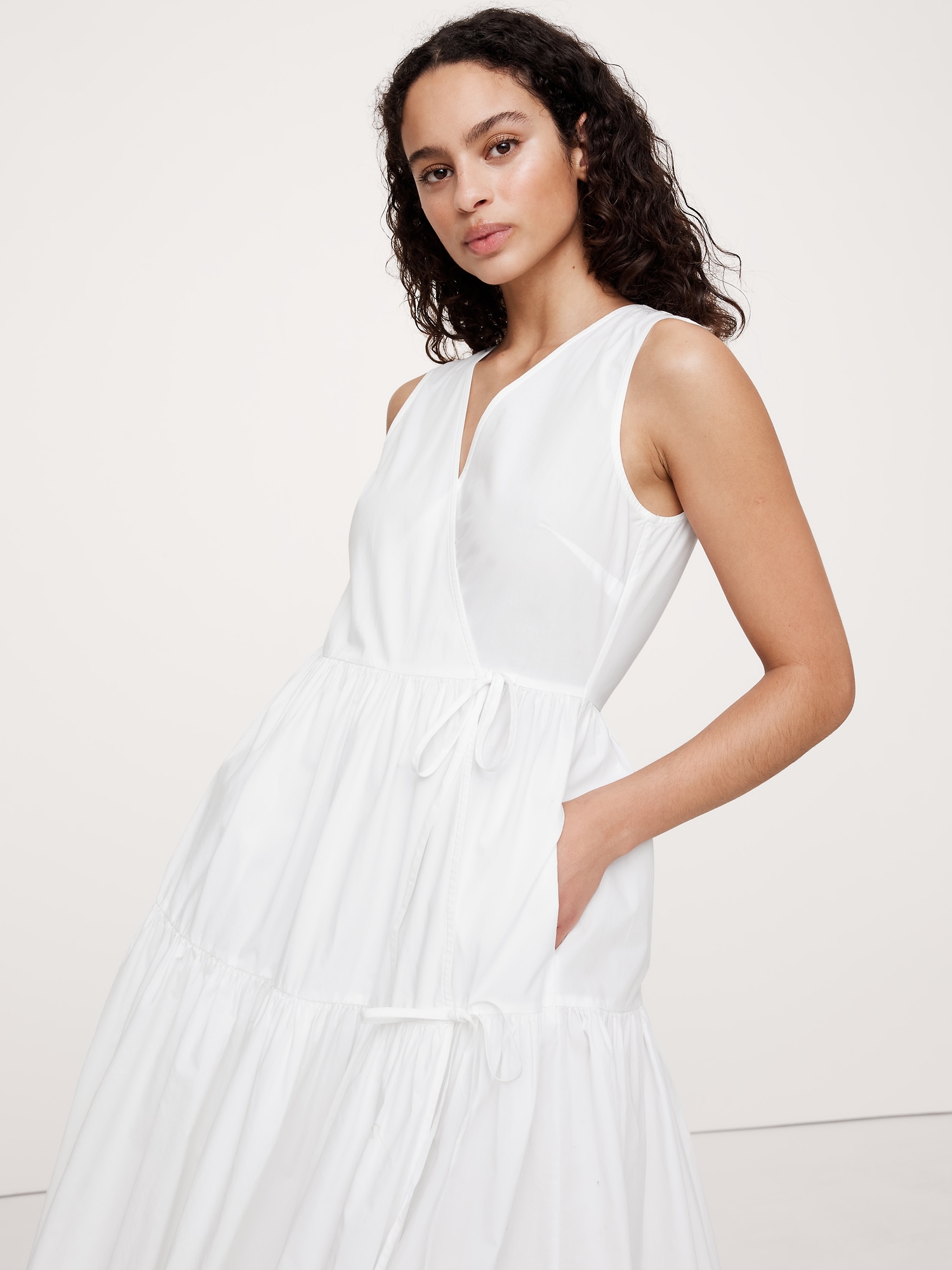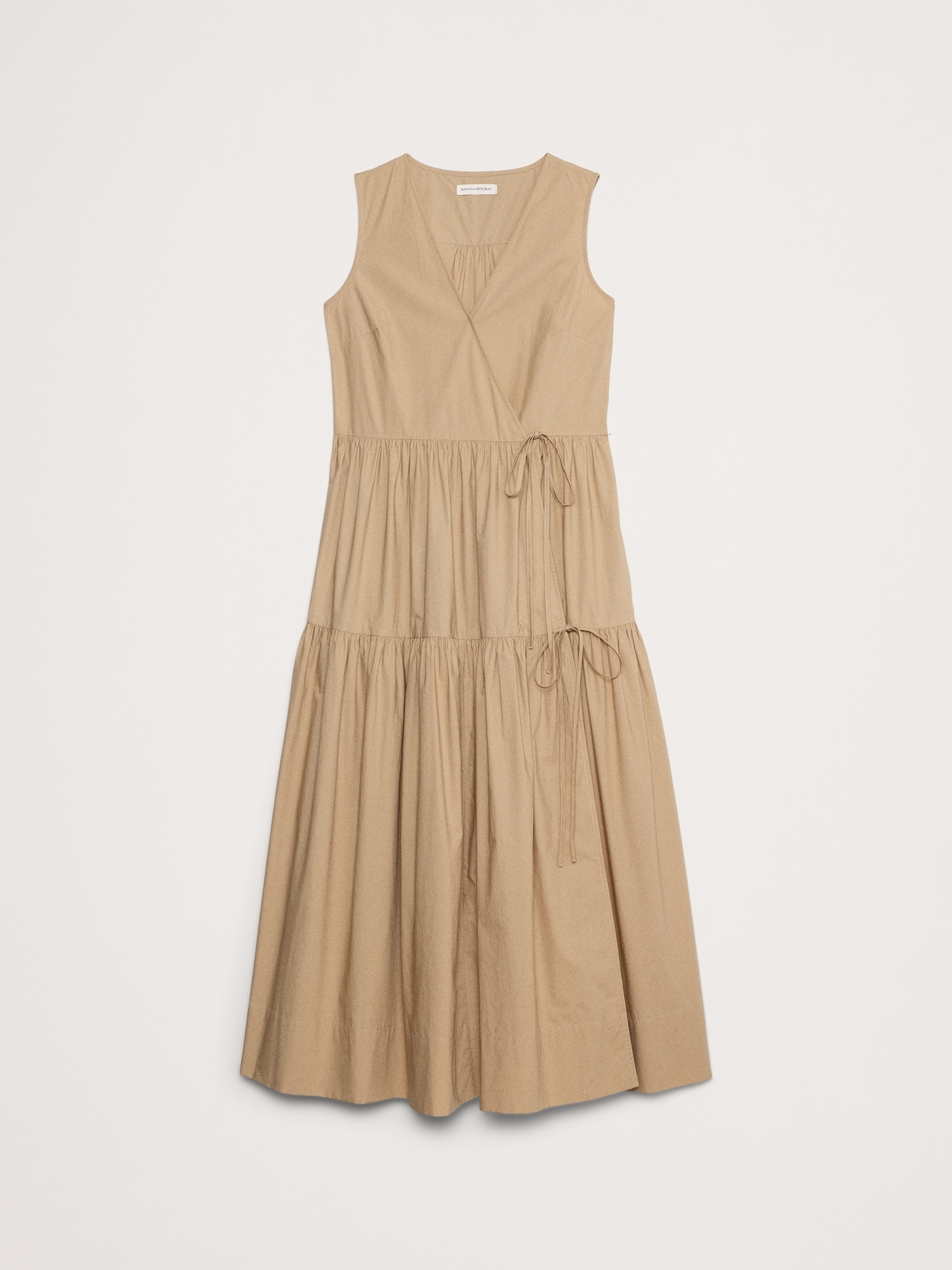 The dress we’ll have on repeat all summer. This tiered wrap dress is crafted in premium cotton poplin. Dress it up with heels and jewelry, or toss it on over your bathing suit and head to the beach.