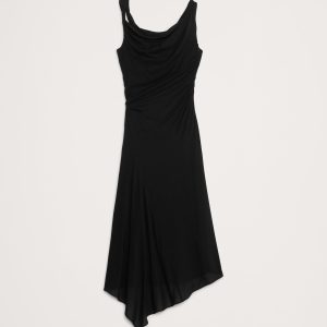 An architectural take on the 90s slip-dress, cut from a viscose crepe that feels light-as-chiffon with a subtle stretch. A twisted shoulder detail, ruching at the side, and bias-cut panels enhance its fit-and-flare silhouette.