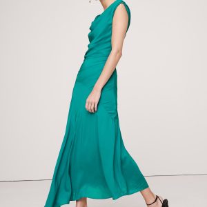 An architectural take on the 90s slip-dress, cut from a viscose crepe that feels light-as-chiffon with a subtle stretch. A twisted shoulder detail, ruching at the side, and bias-cut panels enhance its fit-and-flare silhouette.