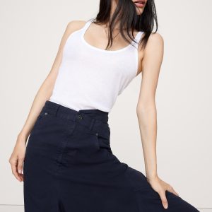 Deconstructed, reconstructed. We borrowed the five-pocket styling of your fave pair of jeans for a twisted midi skirt with crossover waistband. Cut in a soft-but-sturdy cotton canvas and finished with a garment wash for softness and lived-in color.