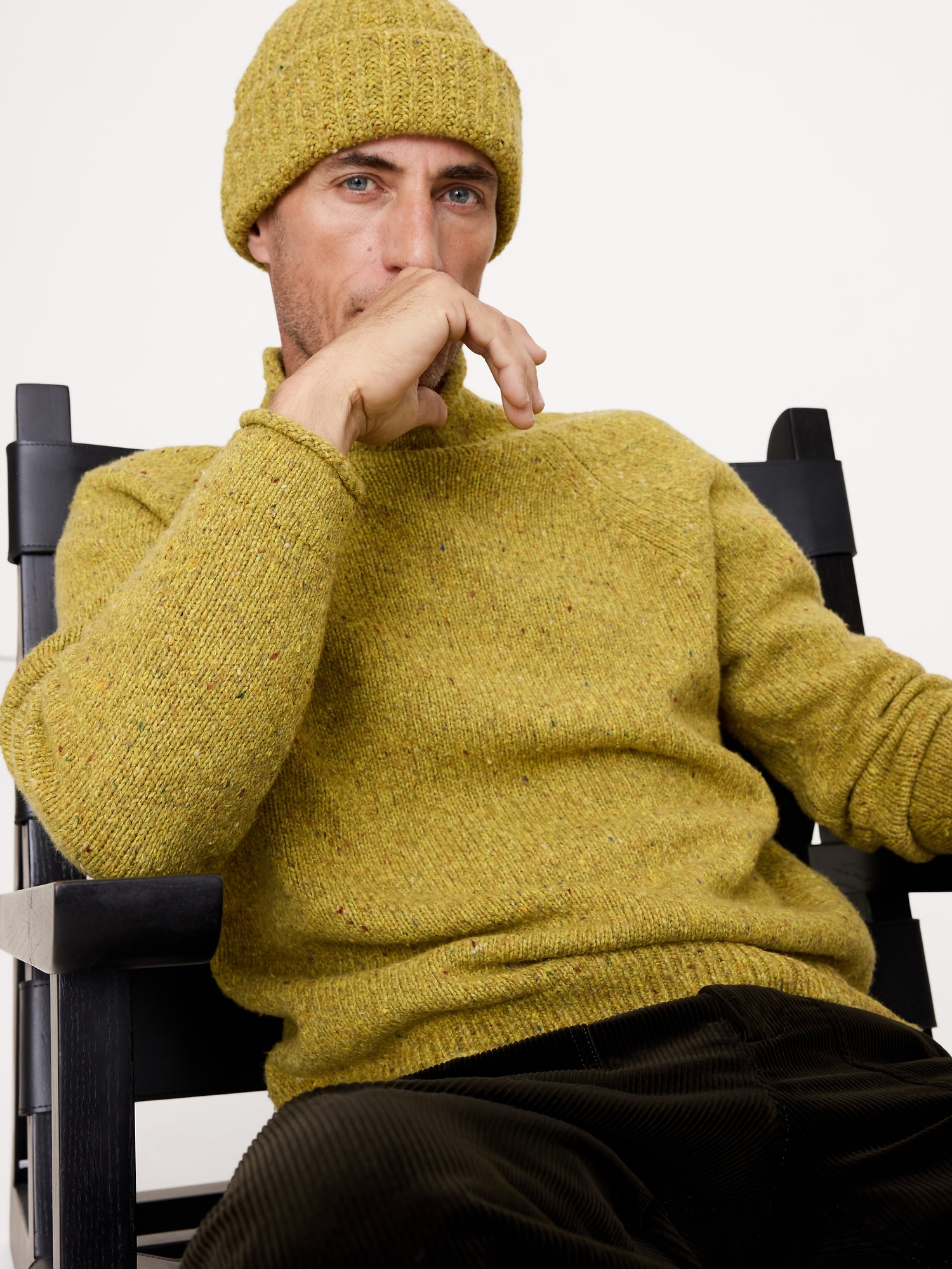 Our take on the classic roll-neck sweater, we knit this one in one of our warmest wool-blend yarns from Italy—one we love for its Donegal-style speckled look.