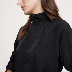 A classic button-down shirt with a twist. We offset the button placket and opted for a stand collar—leave it buttoned all the way up or unbutton a few for an asymmetrical neckline. Cut in our drapey twill so it’s a bit more dressed up.