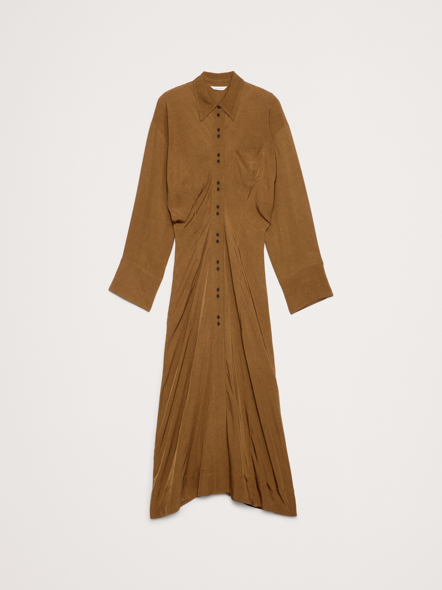 We love a shirt dress because you can wear them basically everywhere. Here, we kept the fit easy through the shoulders and chest, but defined the waist. Cut in our drapey twill so it’s a bit more dressed up. Blouson fit: Relaxed through chest and shoulders, defined waist with an A-line skirt. Point collar with button front. Chest pocket. Unlined. #817701