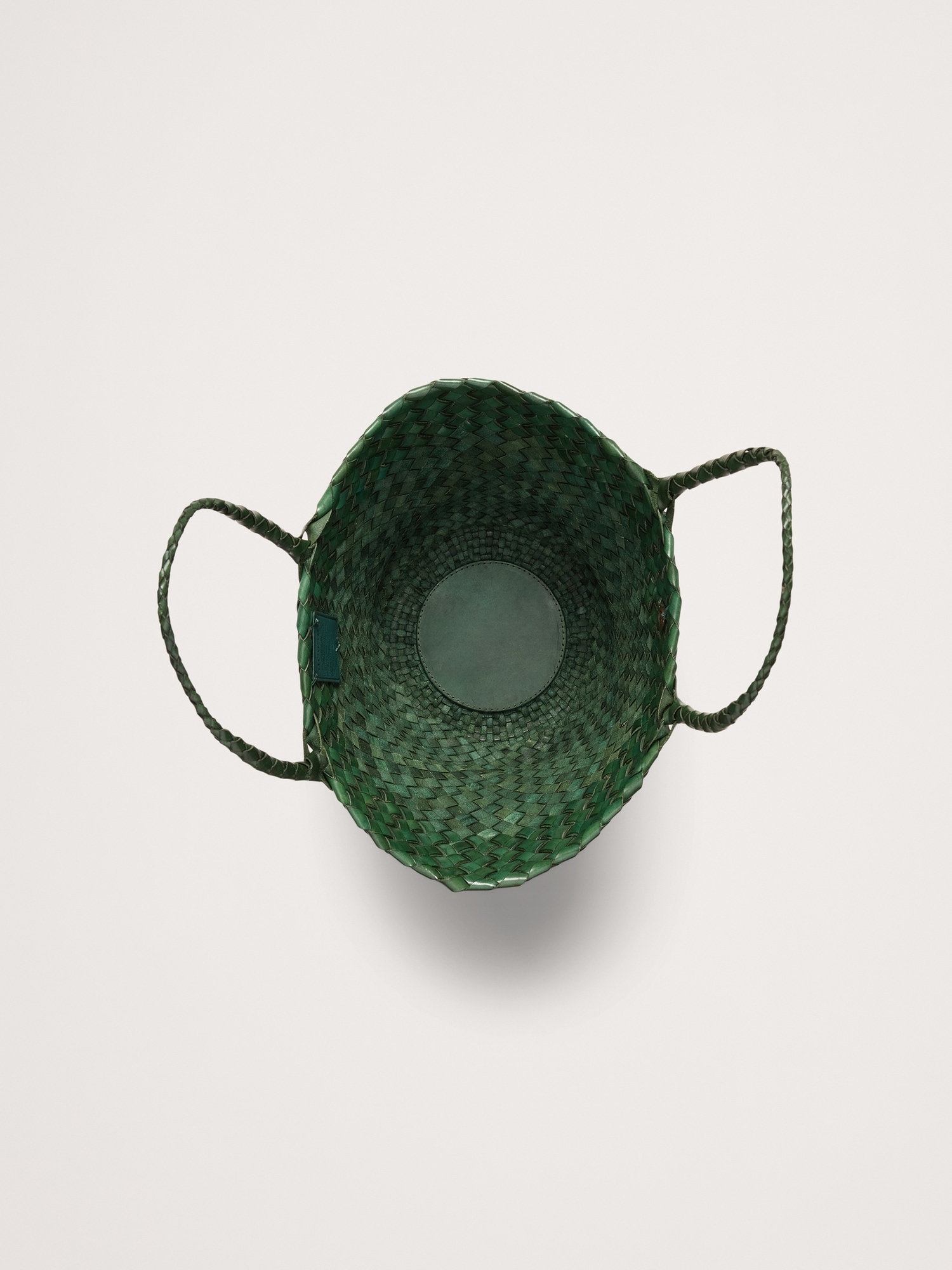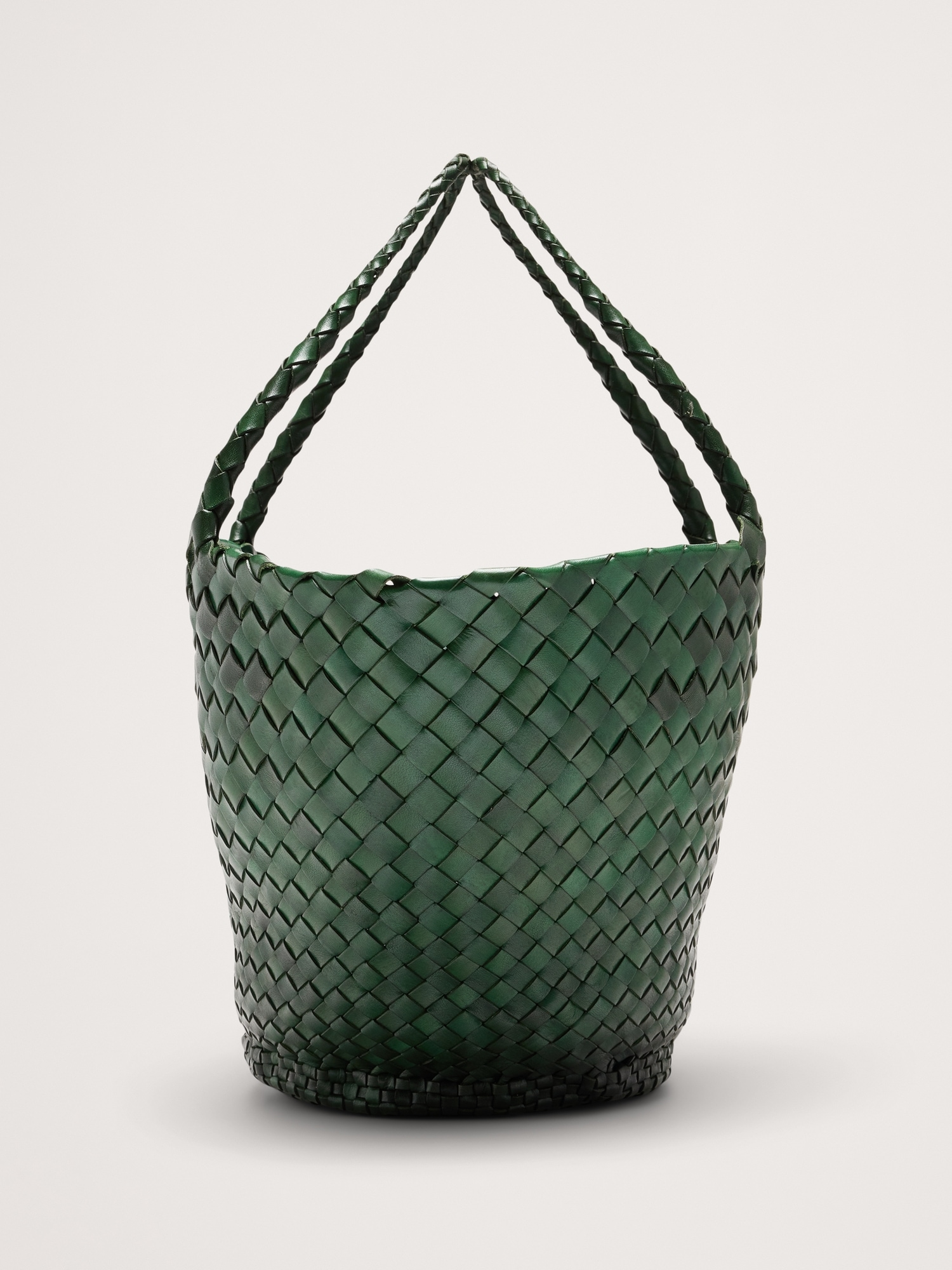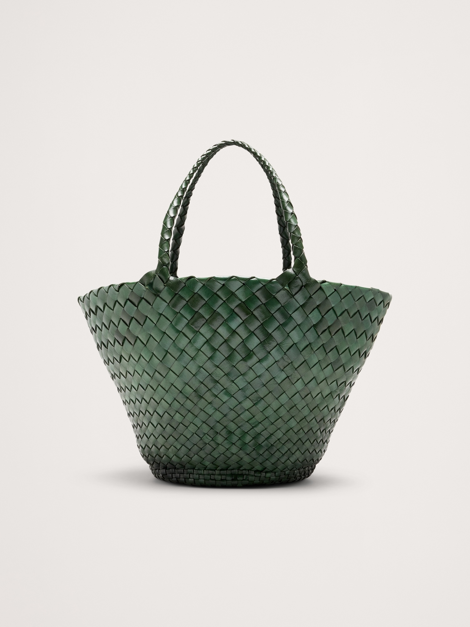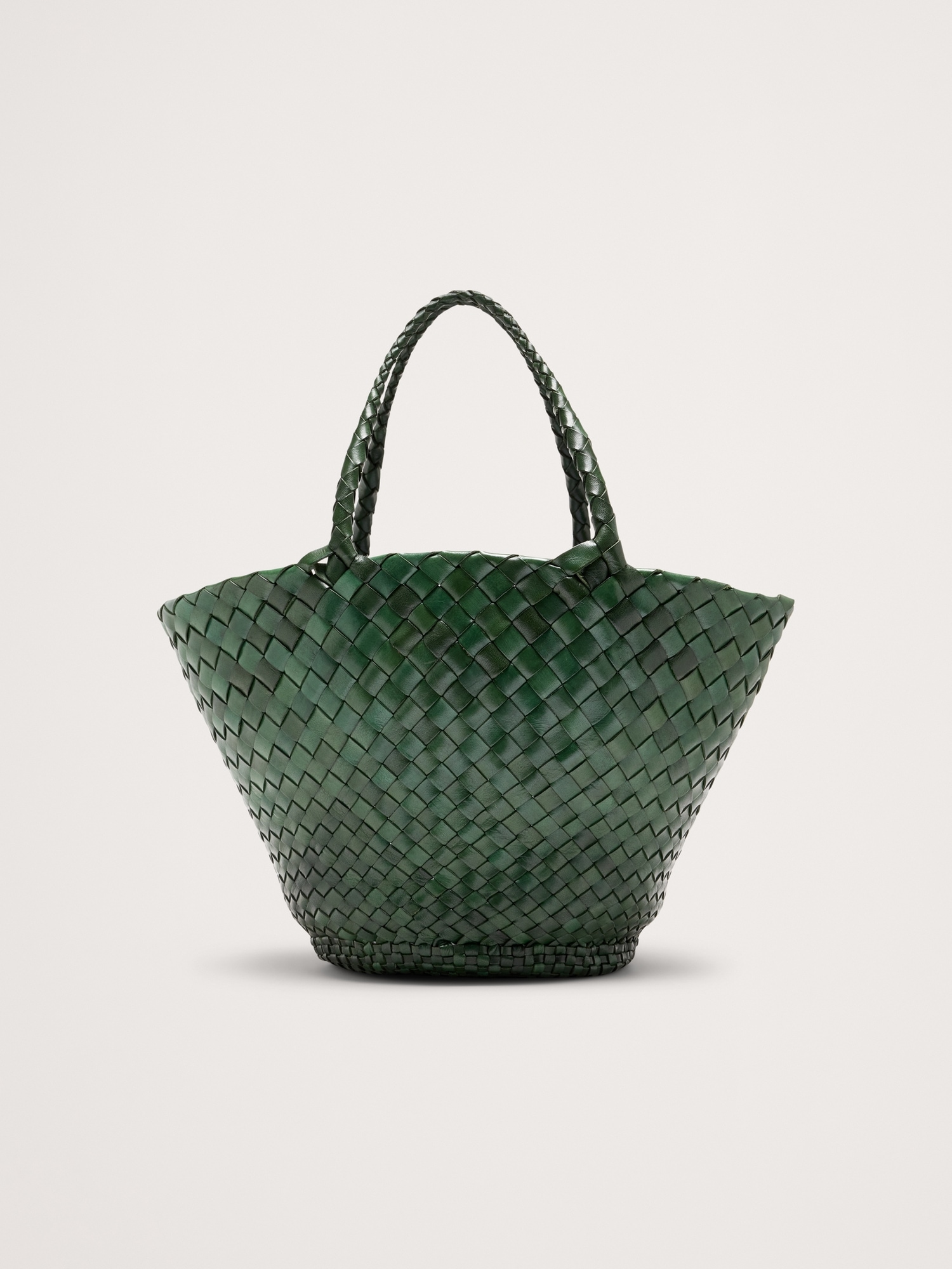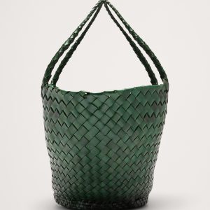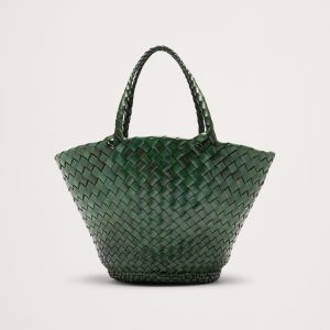 Egola reinterprets traditional basket weaving techniques into a modern accessory, featuring a striking pattern of irregularly woven tapered leather strips. This woven leather bag boasts an open top design, making it versatile and suitable for all seasons.