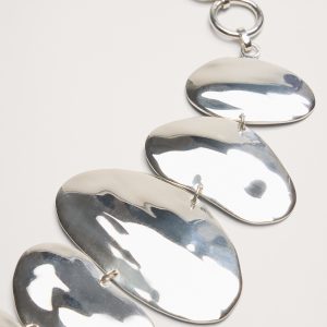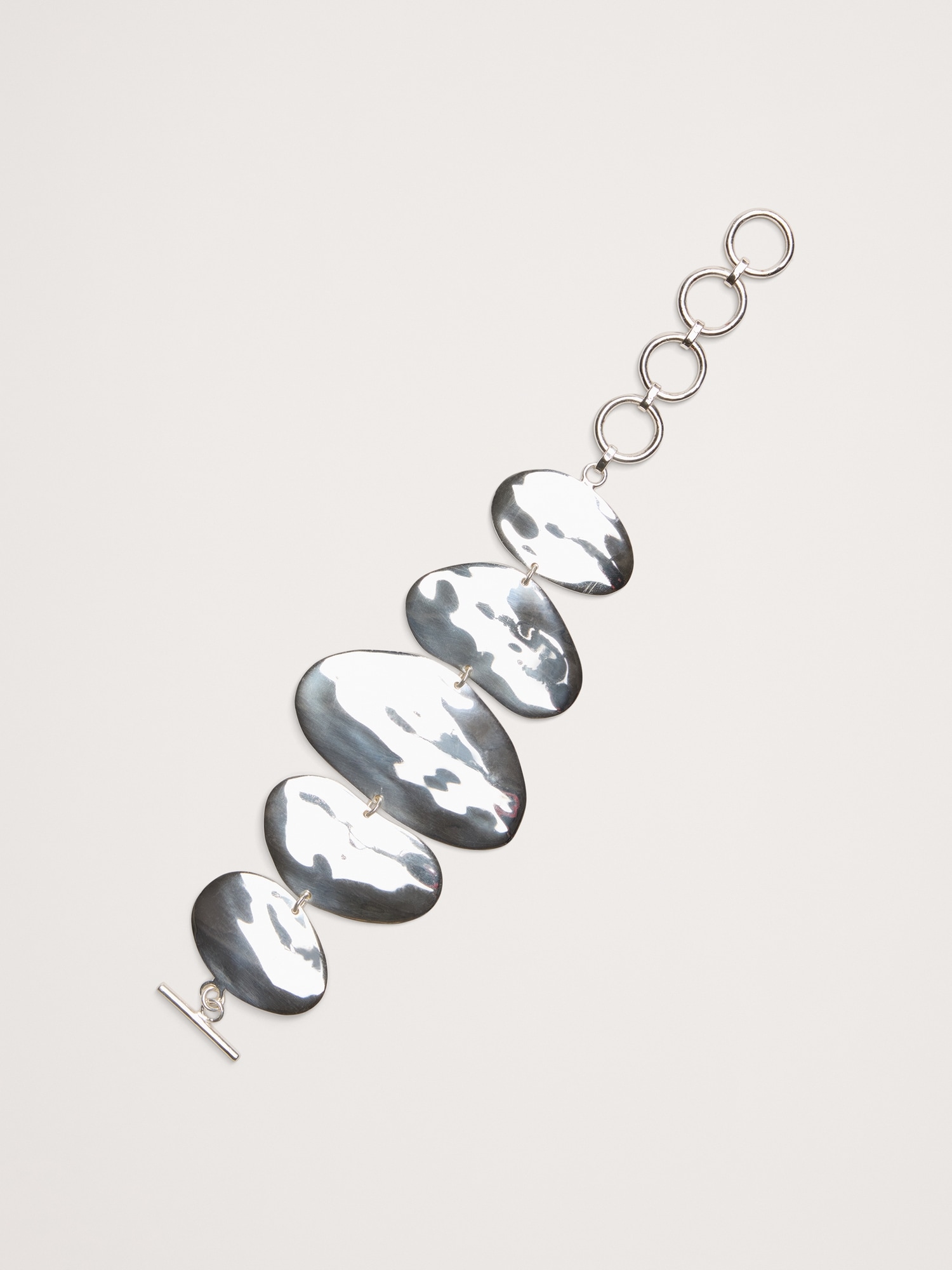 A series of captivating abstract ellipses with gently undulating texture in highly polished silver plating encircle the wrist.