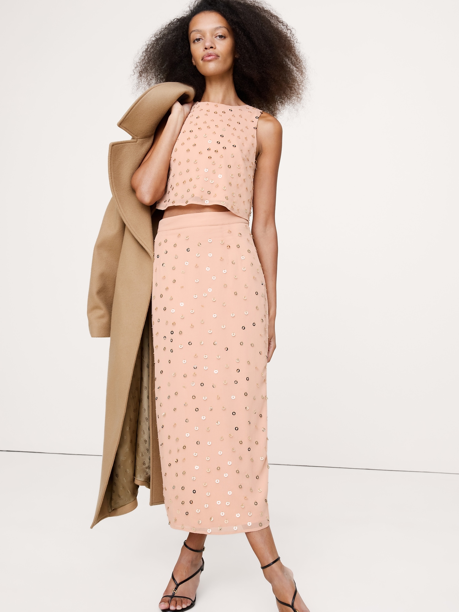 A top to make dressing-up feel effortless, we cut this one from chiffon embellished with gold paillettes and left the back open with a little overlap.