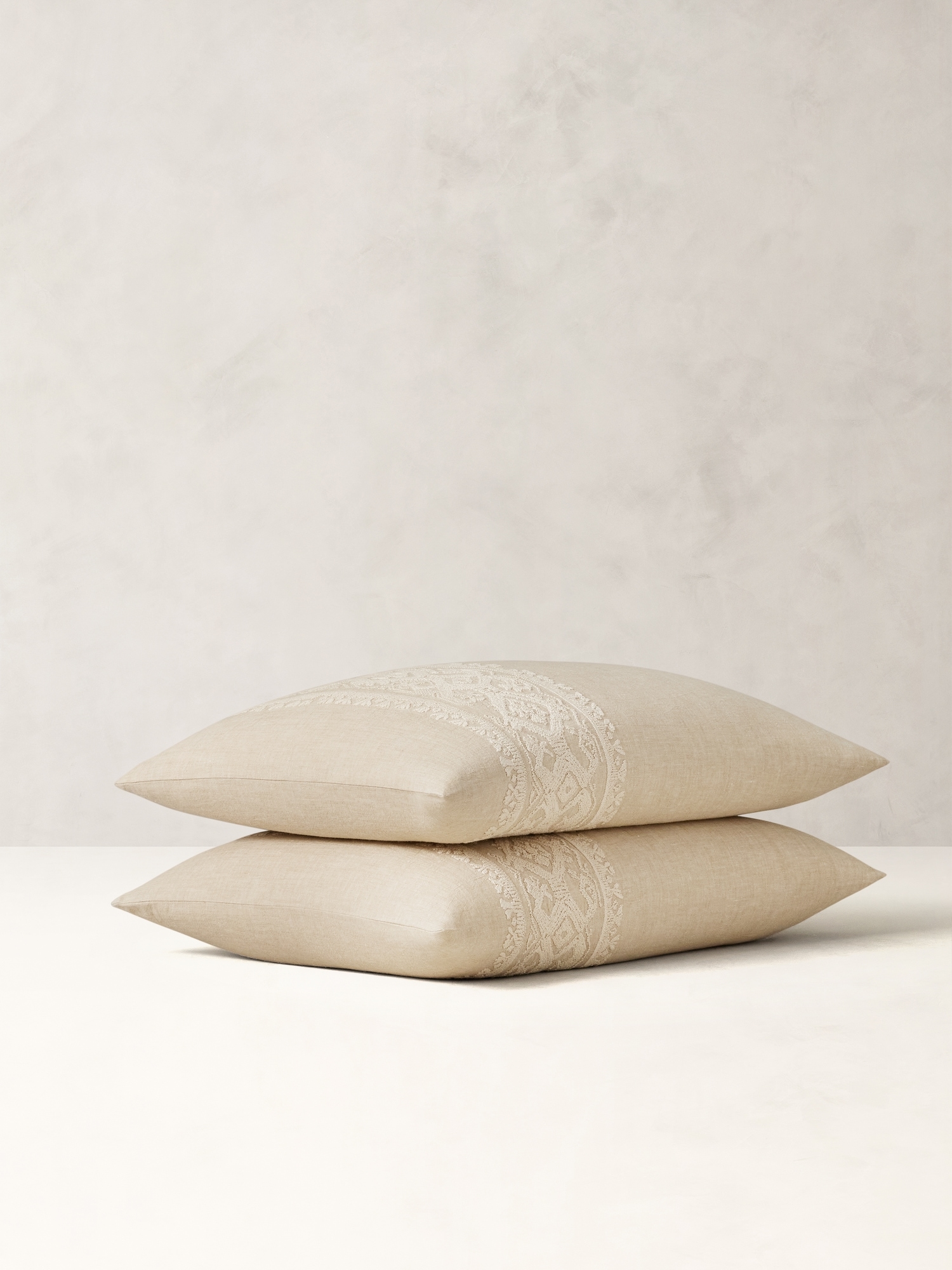 Inspired by artisanal Panchuli weaves from the Himalayan foothills, our shams are tailored with an embroidered band of botanical and geometric motifs. Cut from fine linen-cotton fabric that’s specially washed for a relaxed, yet crisp feel, its all-weather weight offers year-round comfort. Pairs with the coordinating duvet for a cohesive look.