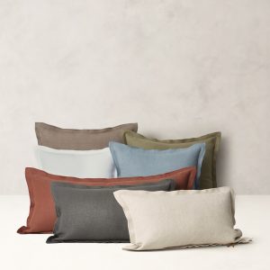 Luxe linen, garment-dyed for dimensional color. Expertly woven of fine linen, our pillow cover is specially dip-dyed for refined tonal beauty and accented with flanged details and a leather pull. Exposed zip closure and leather pull. Made in India. Pillow inserts are sold separately and are sized slightly larger than our pillow covers to create a fuller effect. #618737