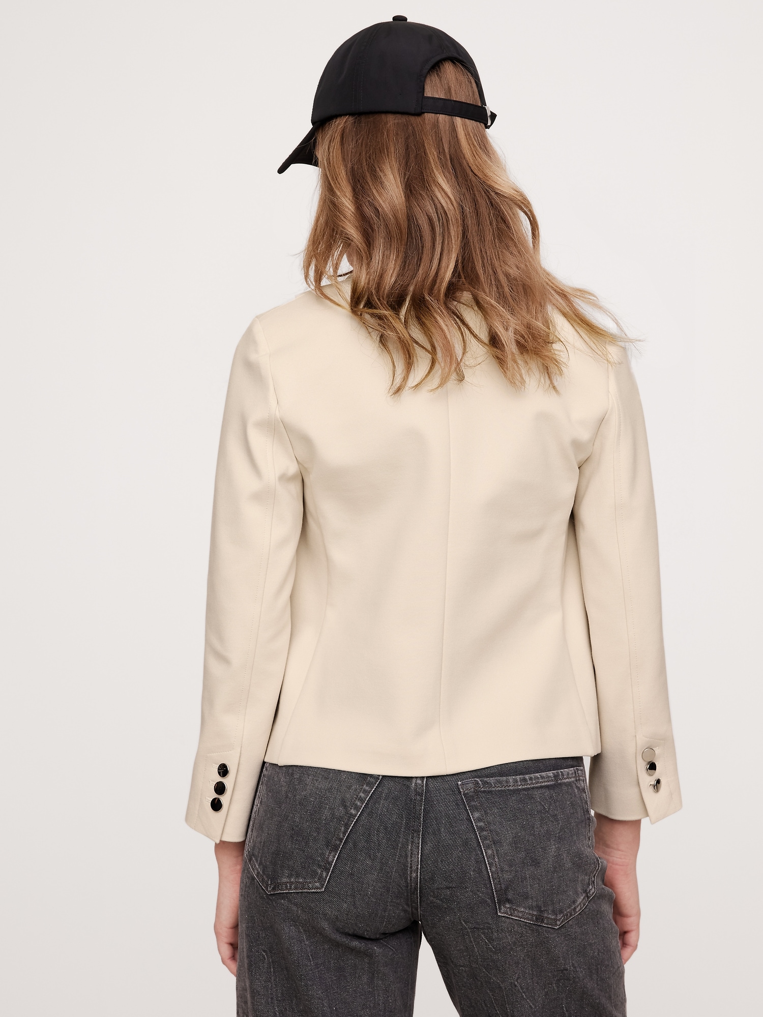 We cut this blazer in shrunken proportions using our Everywhere Ponte fabric—a favorite for its dressed-up look and high stretch for comfort. We added bracelet-length sleeves and small shoulder pads for a tailored silhouette, but opted for a butterfly lining at back.
