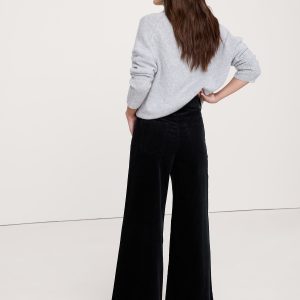 High rise (12\”). Fitted waist, relaxed hip and thigh with a wide leg. Full length.