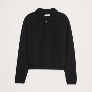 Team Cozy. We reached for one of our softest sweatshirt fleeces here, opting for a boxy, relaxed fit and zip-placket polo collar for a vintage vibe.