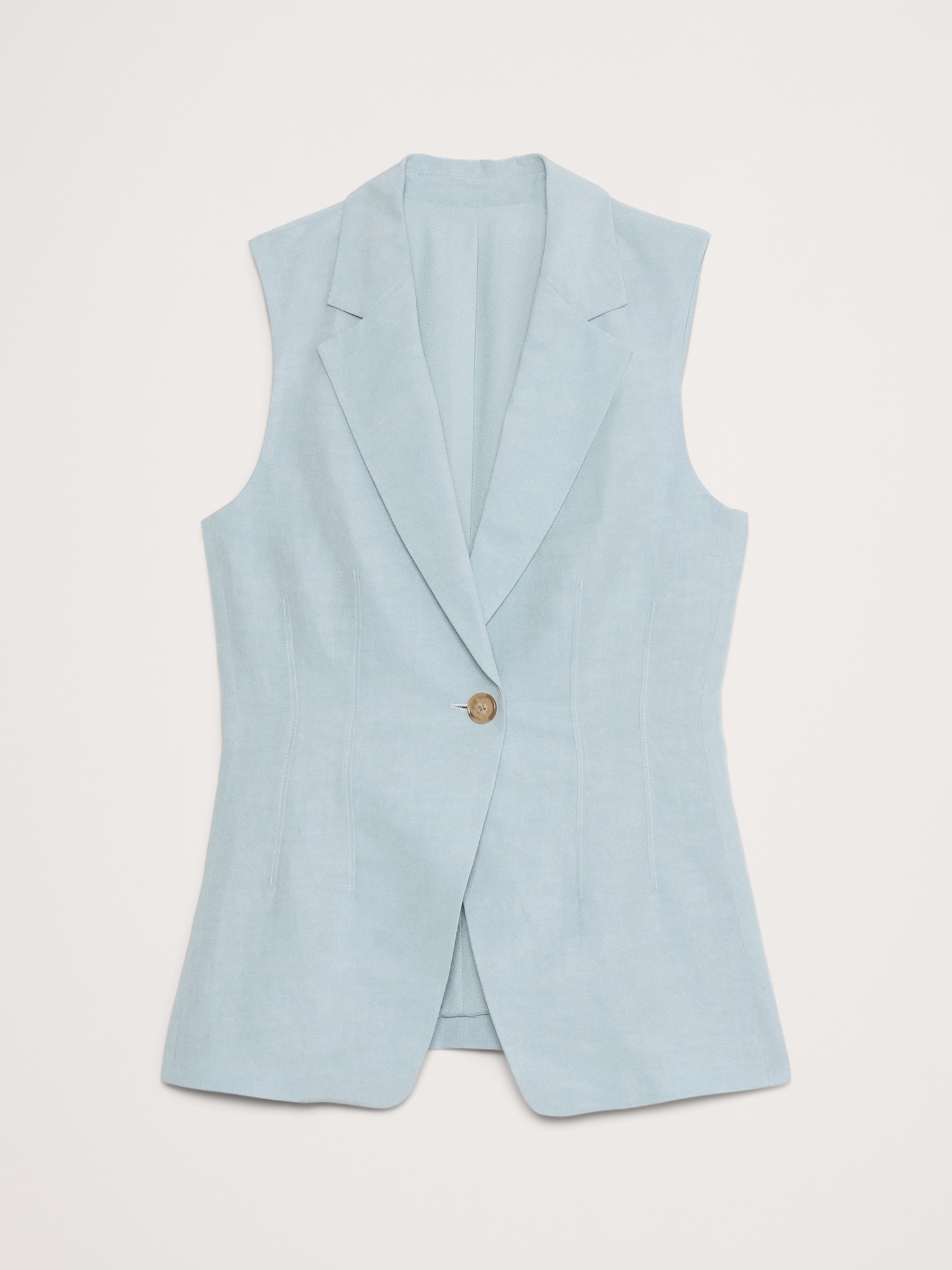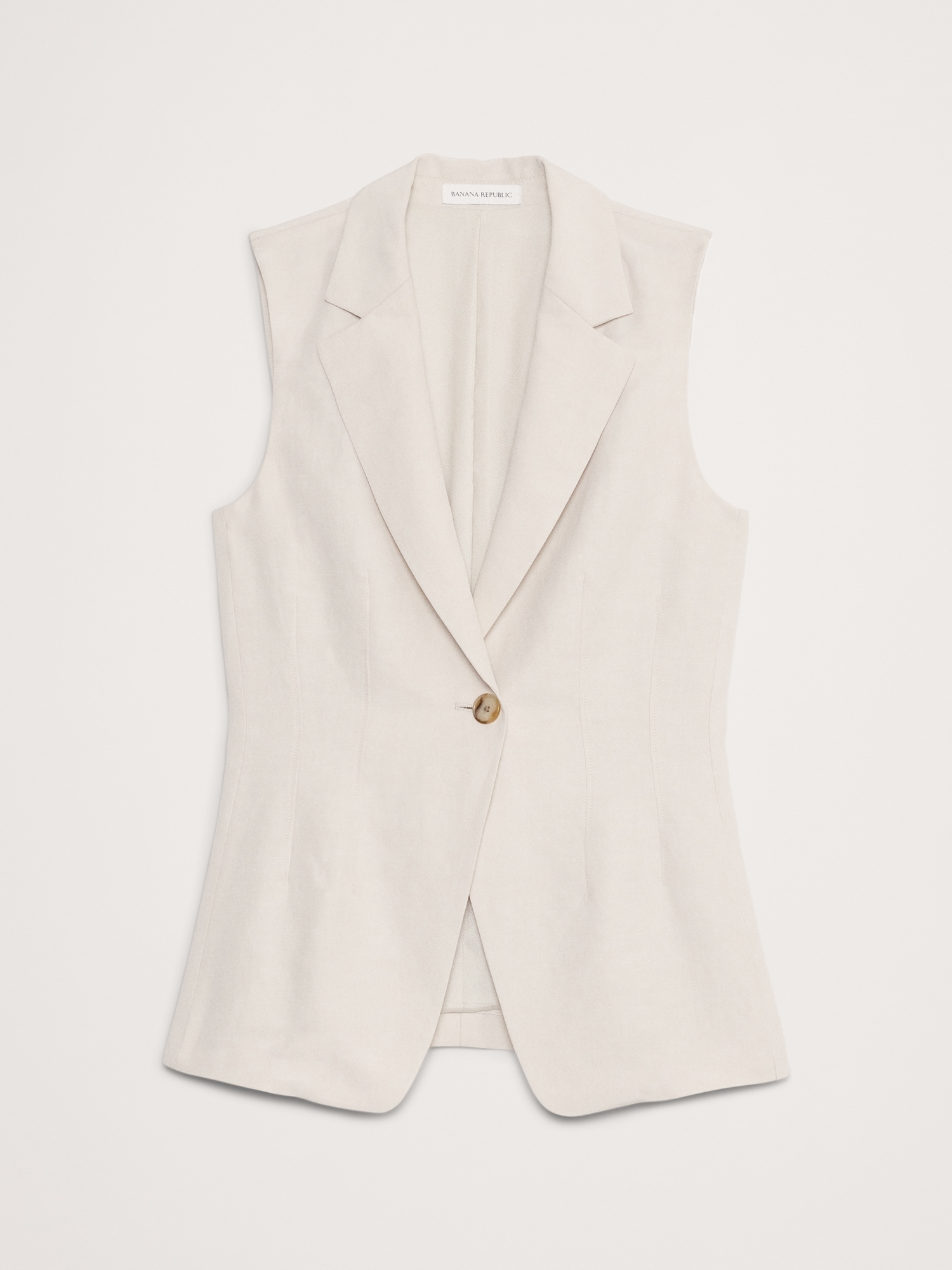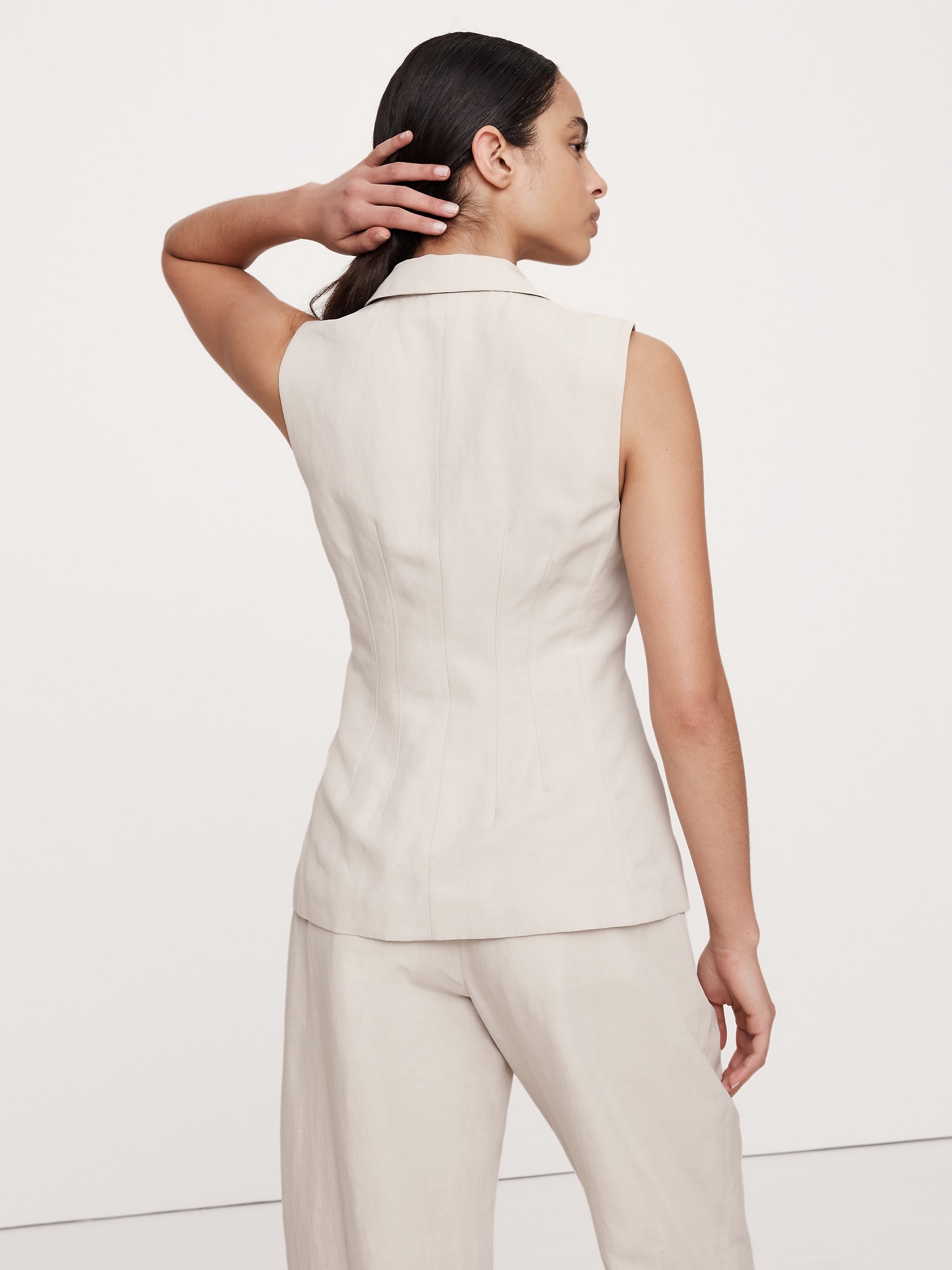 We styled this vest with darts at the back to nip in the waist, crafted in a silky blend of TENCELâ„¢ and linen that’s ready for warm weather. Make it a set with the matching shorts or pants.