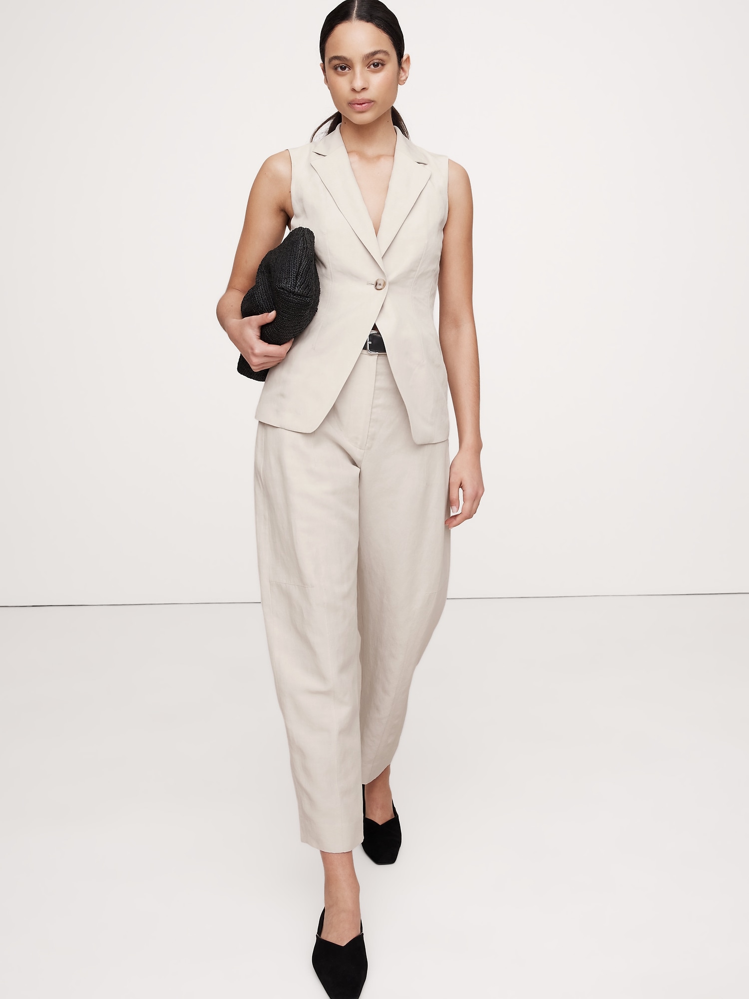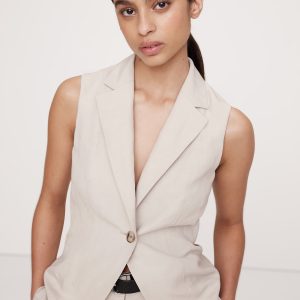 We styled this vest with darts at the back to nip in the waist, crafted in a silky blend of TENCELâ„¢ and linen that’s ready for warm weather. Make it a set with the matching shorts or pants.