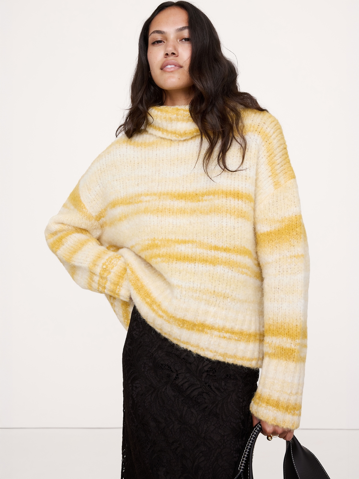 So soft, so warm, this fluffy sweater is made from a luxe alpaca blend—here, in an oversized silhouette with a funnel neck.