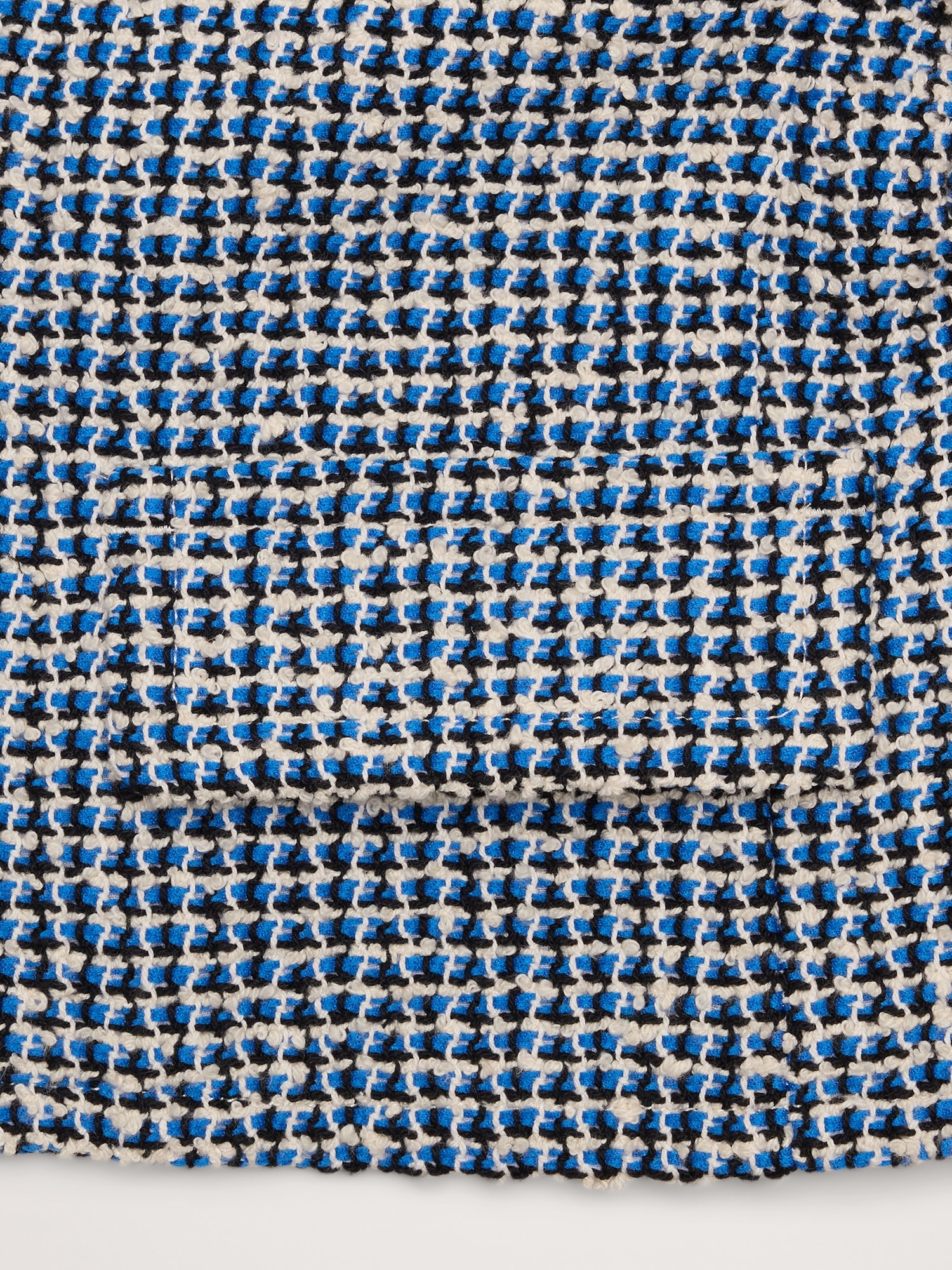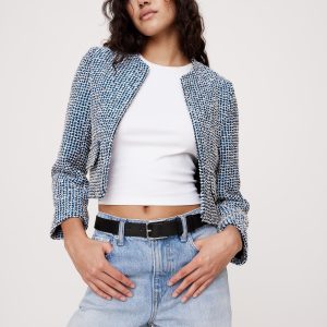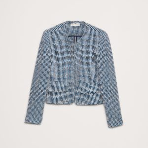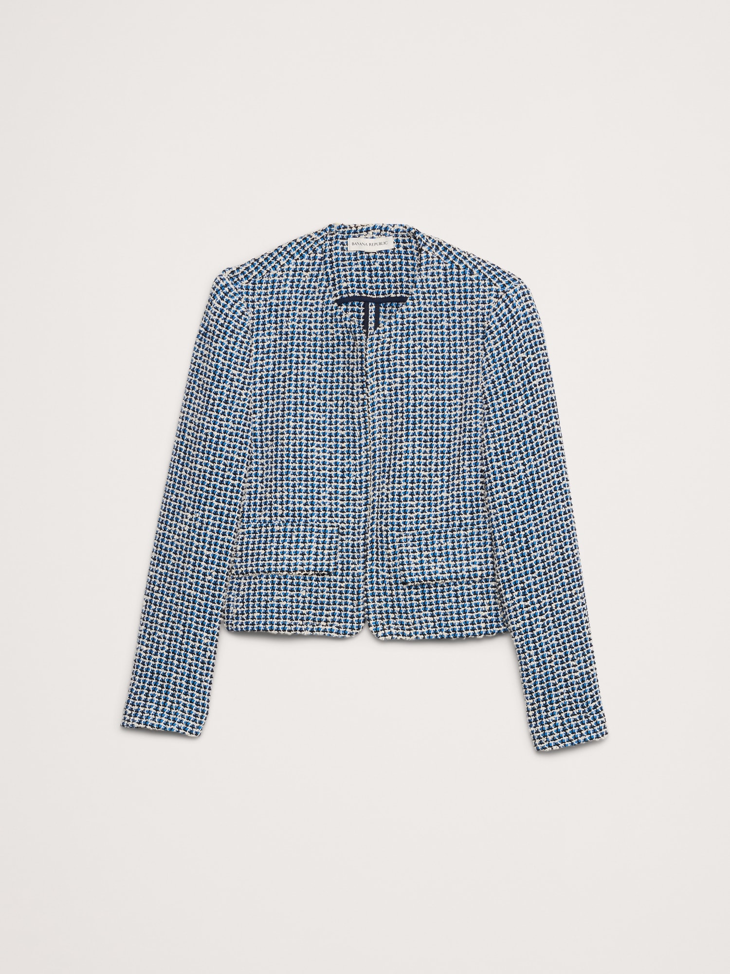 A little tailored, a little at-ease, this collarless lady jacket is sophisticated, yet never stuffy thanks to a cropped length, bracelet-length sleeves, and a beautiful, bouclé fabric.