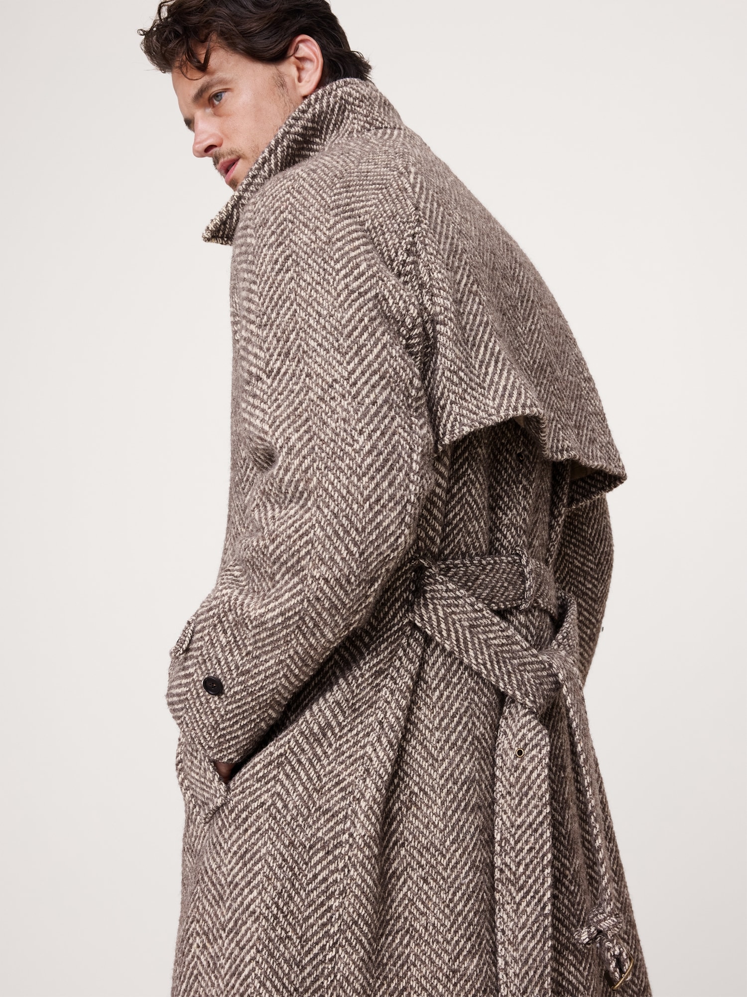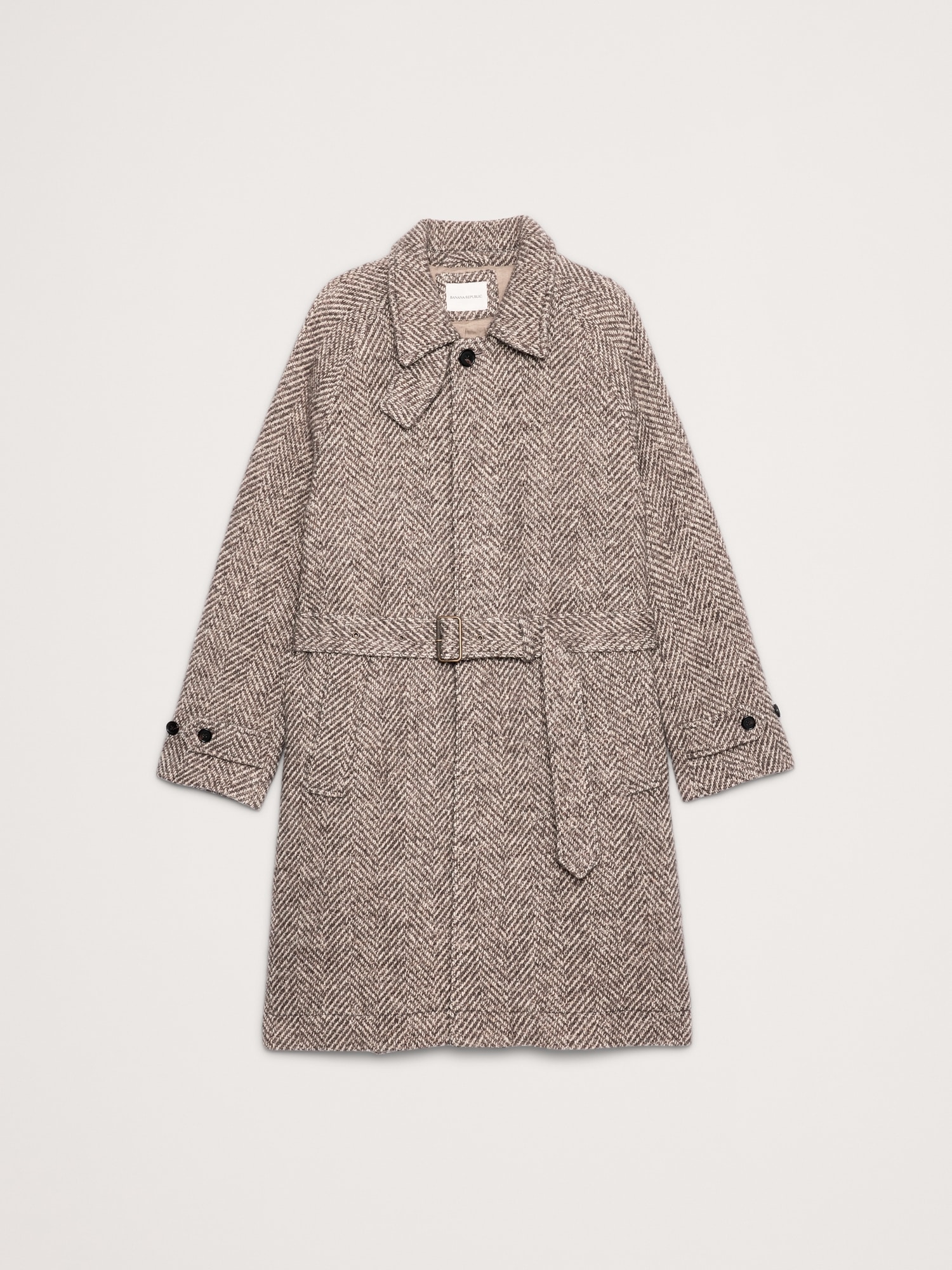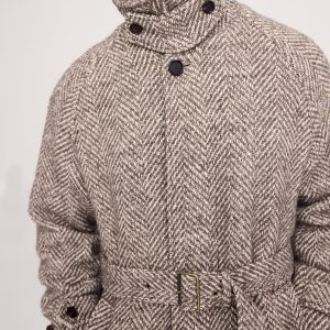 Modeled after the traditional Balmacaan coat, this piece is cut from an Italian, wool-blend fabric woven in a herringbone pattern with a beautiful tweed-like finish.