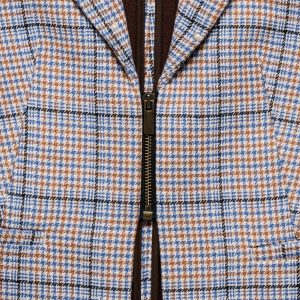 A playful take on a structured blazer, we reached for a beautiful houndstooth plaid fabric from Italy, adding a zip front closure and zips at the cuffs. Leave the cuffs unzipped to let your shirt cuffs peek through.