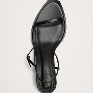 Set atop a modest kitten heel, these sleek almond-toe sandals are crafted with sleek, Italian leather or satin straps that wrap around the foot and ankle for a secure fit.