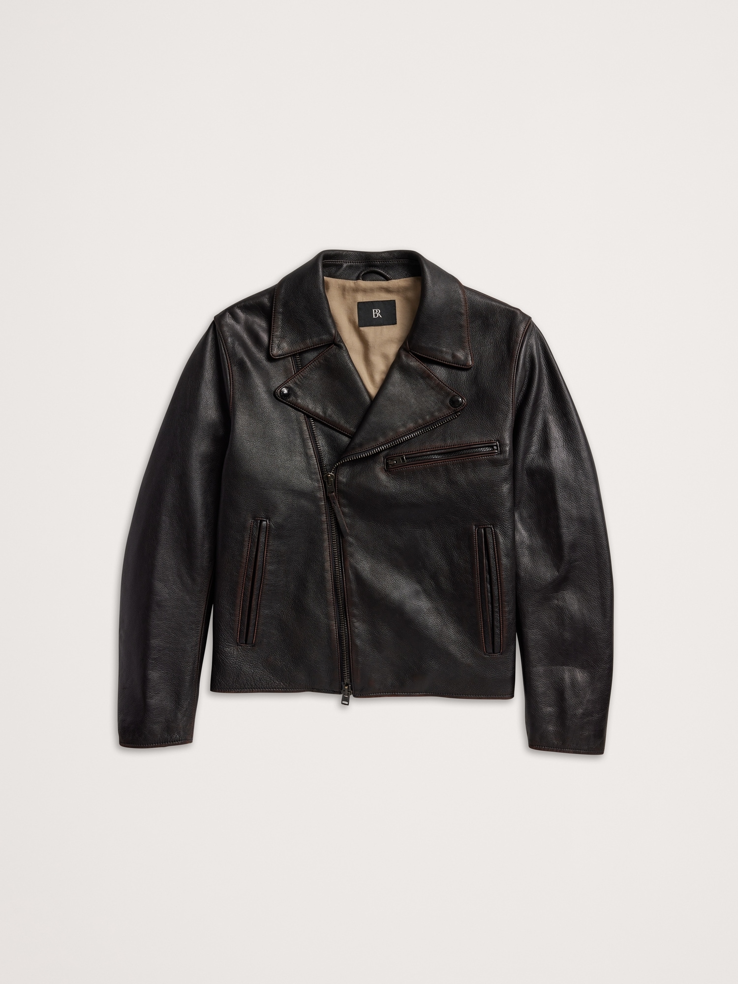 A timeless take on the iconic moto jacket, we kept all the details of the classic—an off-set zip closure, grommets under the arms, zippered cuffs and pockets—adding a Western-style yoke and a ruched accent at the back waist for rugged flair. For a true-to-the-original finish, our designers selected a beautifully burnished leather and an oversized fit.