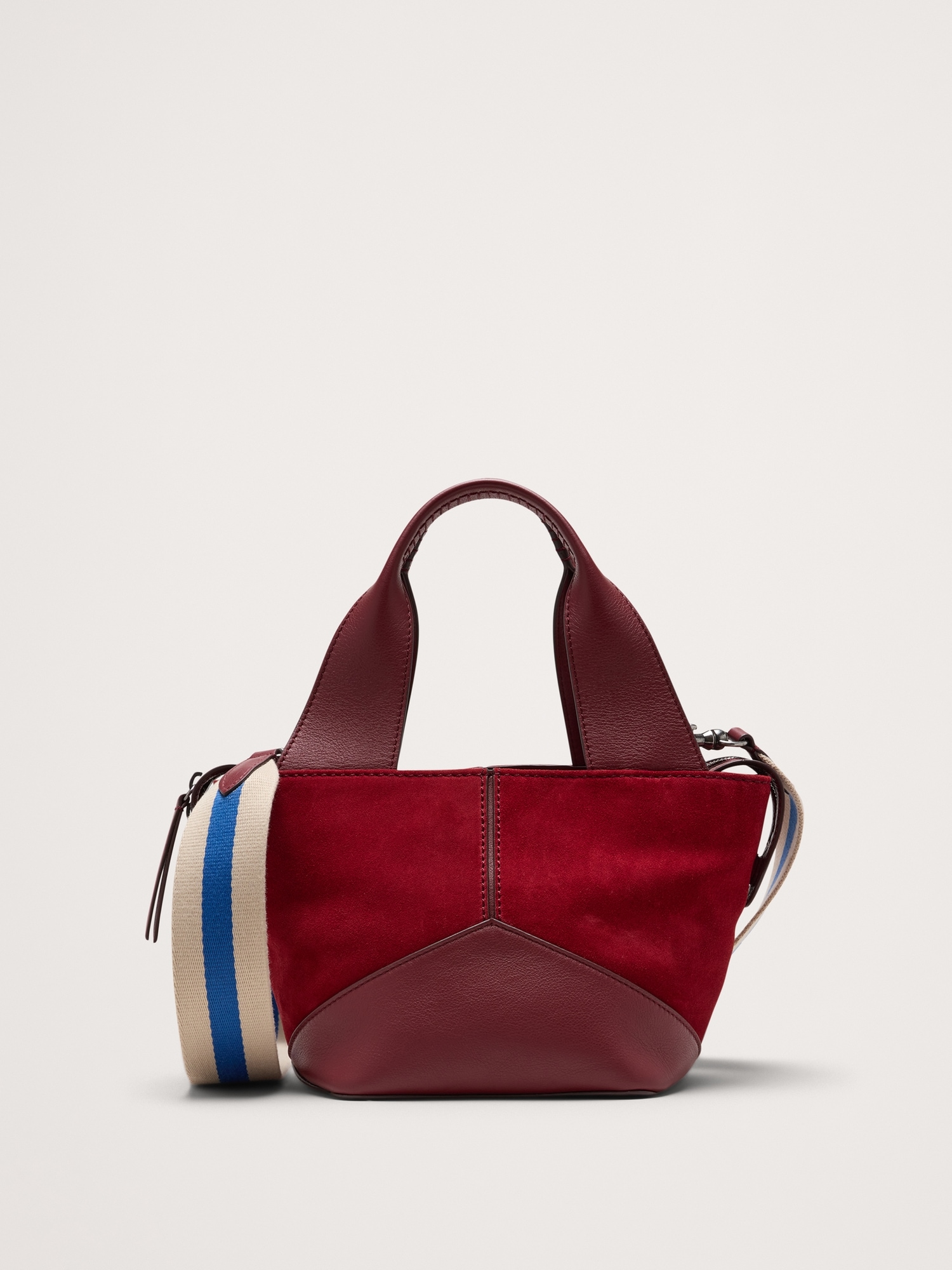 Beautiful materials need no ornamentation. Here, a patchwork tote in a smaller scale that shows off beautiful leathers and suedes from Italy.