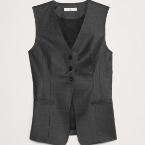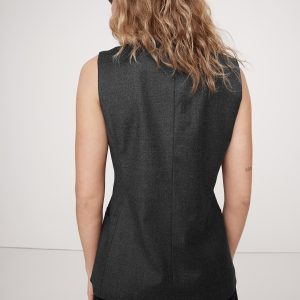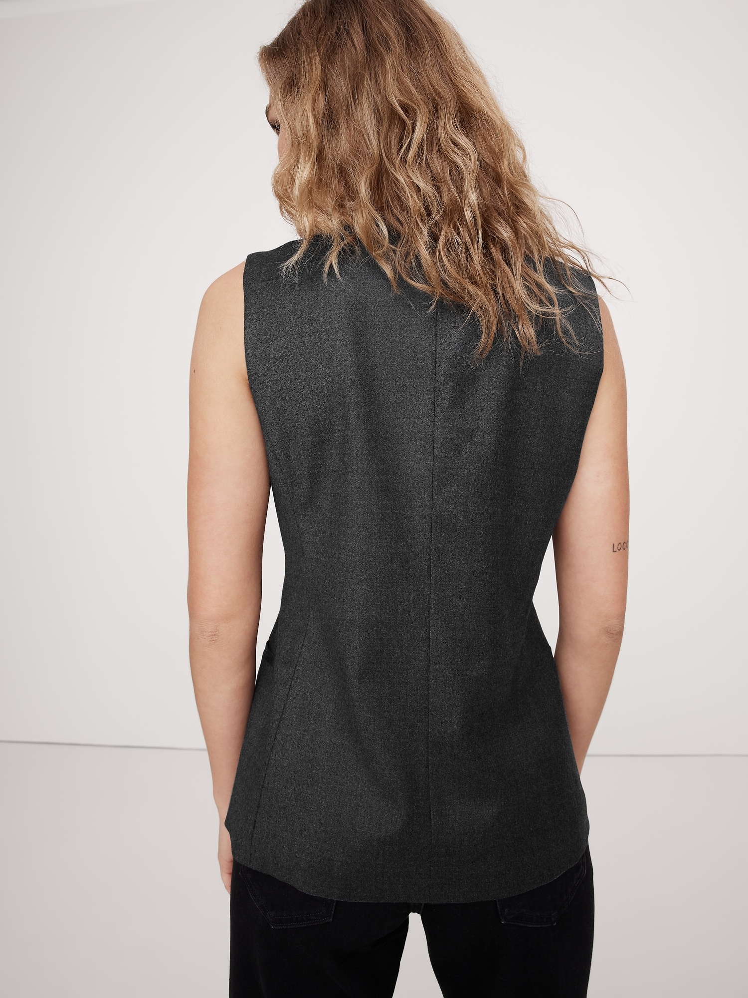 We styled this tailored vest in a longer length with a lapel-free neckline, leaving you to style it layered as a vest or on its own as a top. Here, we reached for an all-season wool flannel fabric with a touch of stretch for comfort.