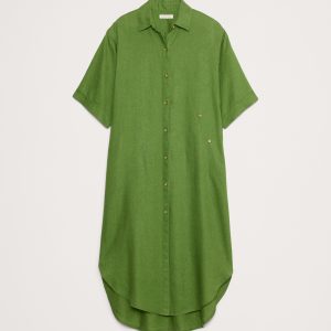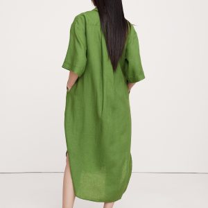 A best-selling style now in 100% certified-European linen, this dress features two sets of buttons: one to wear as an oversized button-front shirt dress and a second set to style as an asymmetrical wrap dress.