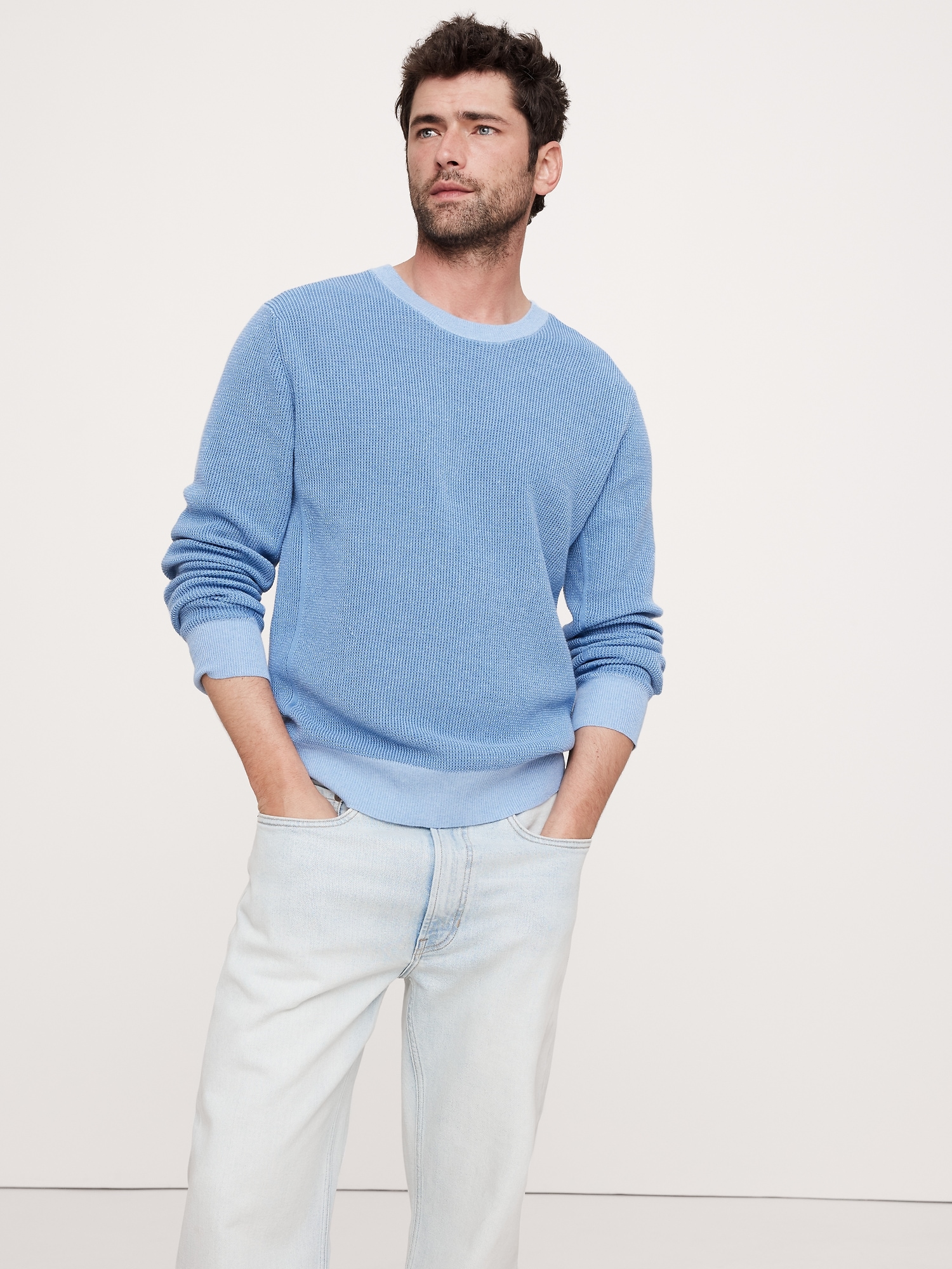 A great year-round sweater in a timeless waffle-knit texture, this crew-neck sweater is made from breathable linen and cotton.