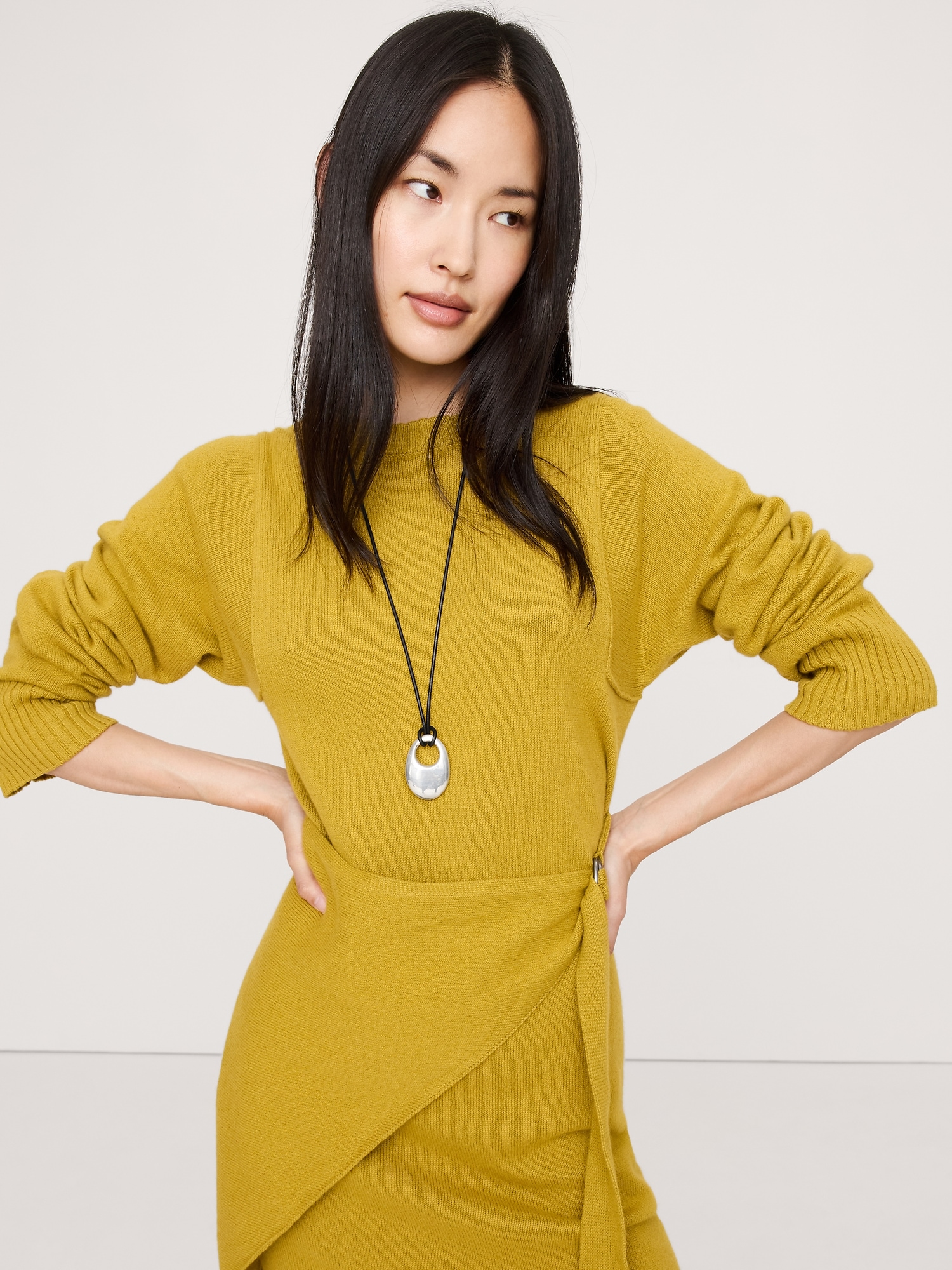 A sculptural silver ring suspended from a simple, leather cord, finished in 999-silver plated brass.