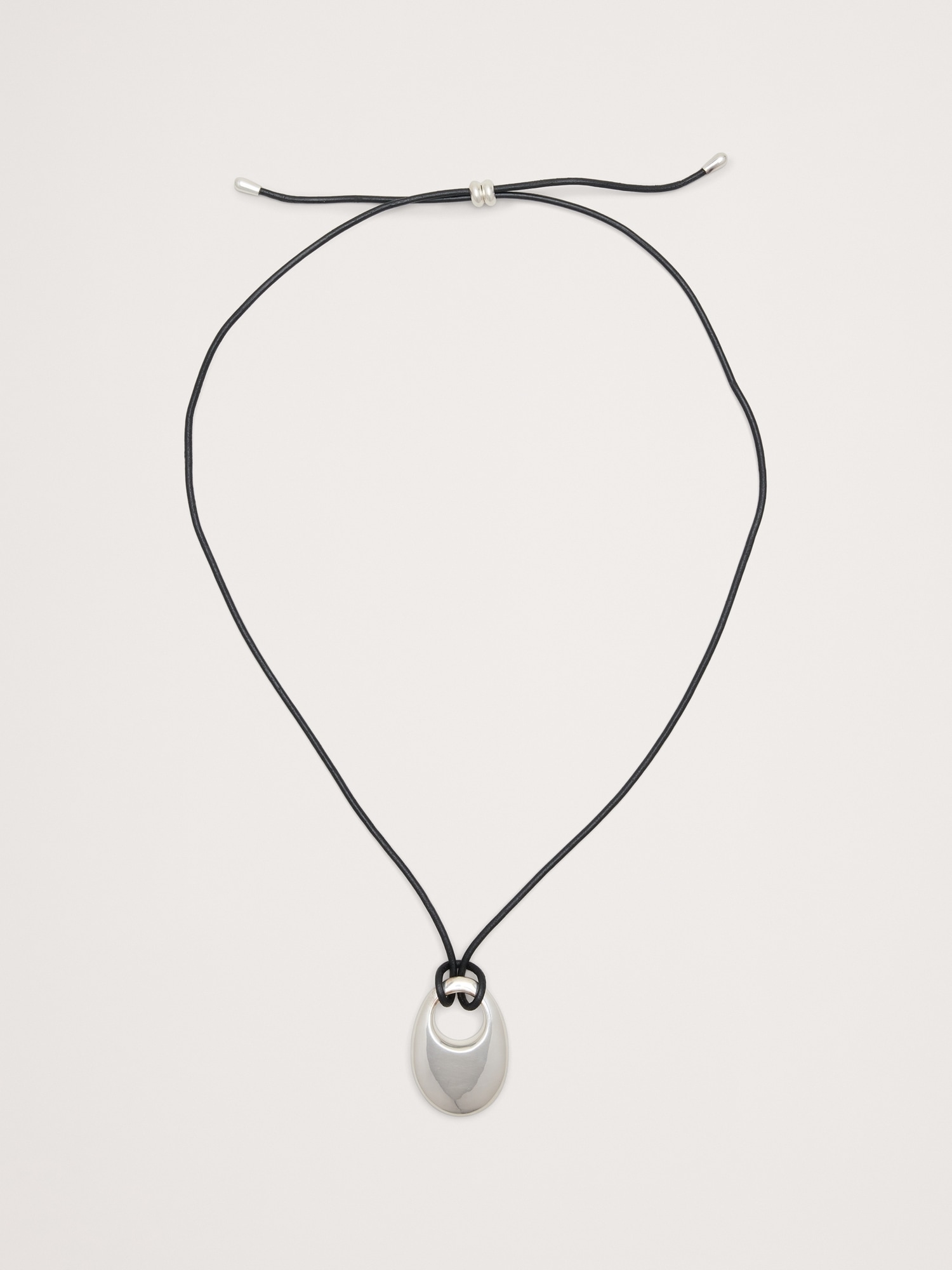 A sculptural silver ring suspended from a simple, leather cord, finished in 999-silver plated brass.