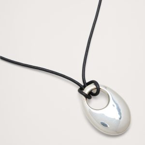 A sculptural silver ring suspended from a simple, leather cord, finished in 999-silver plated brass.